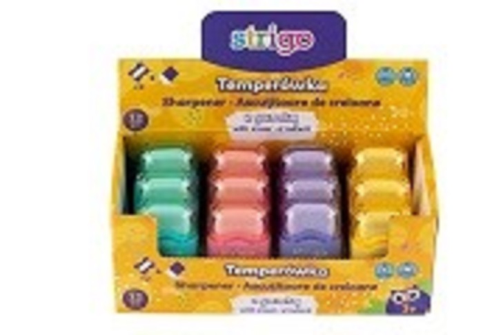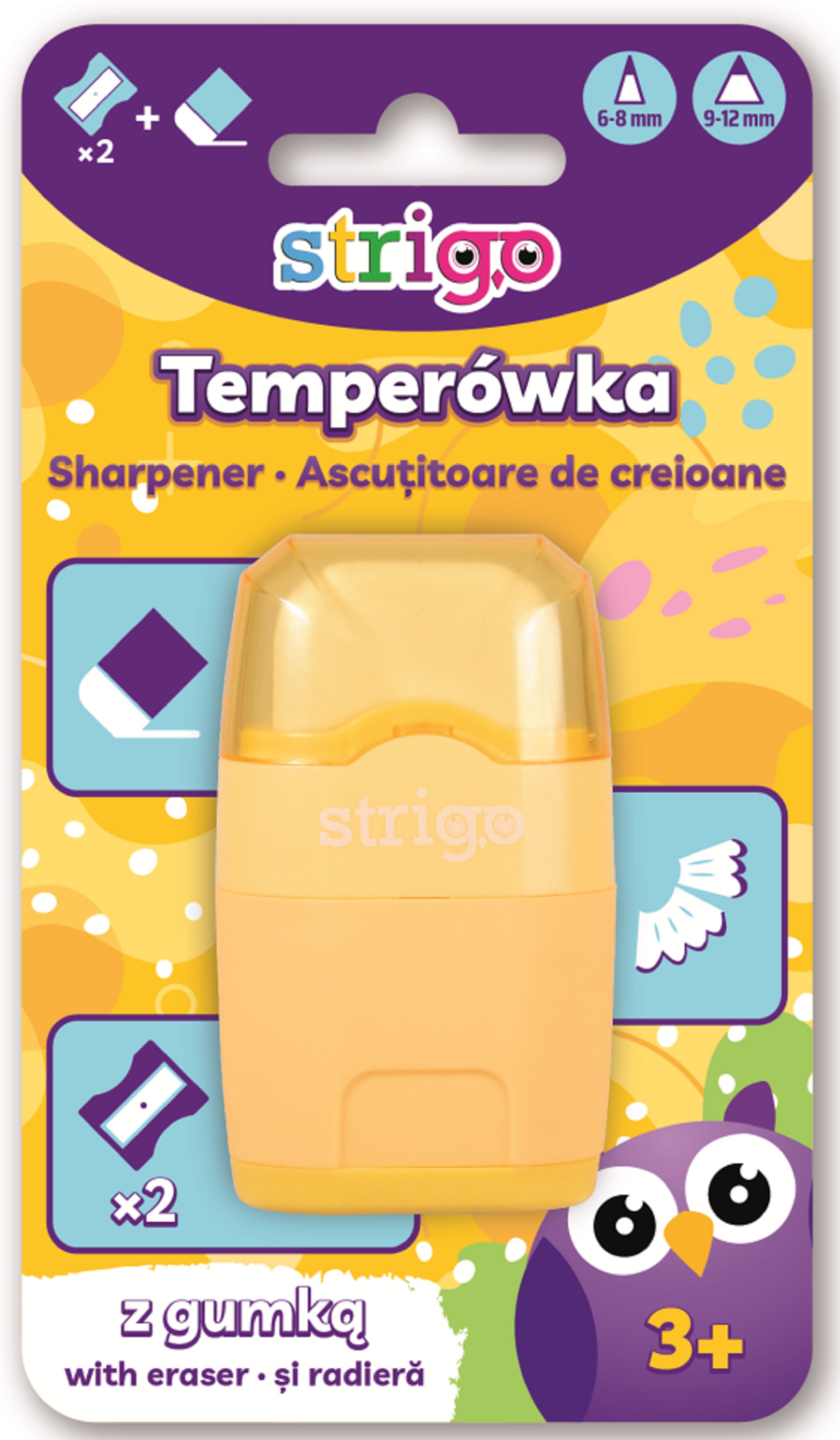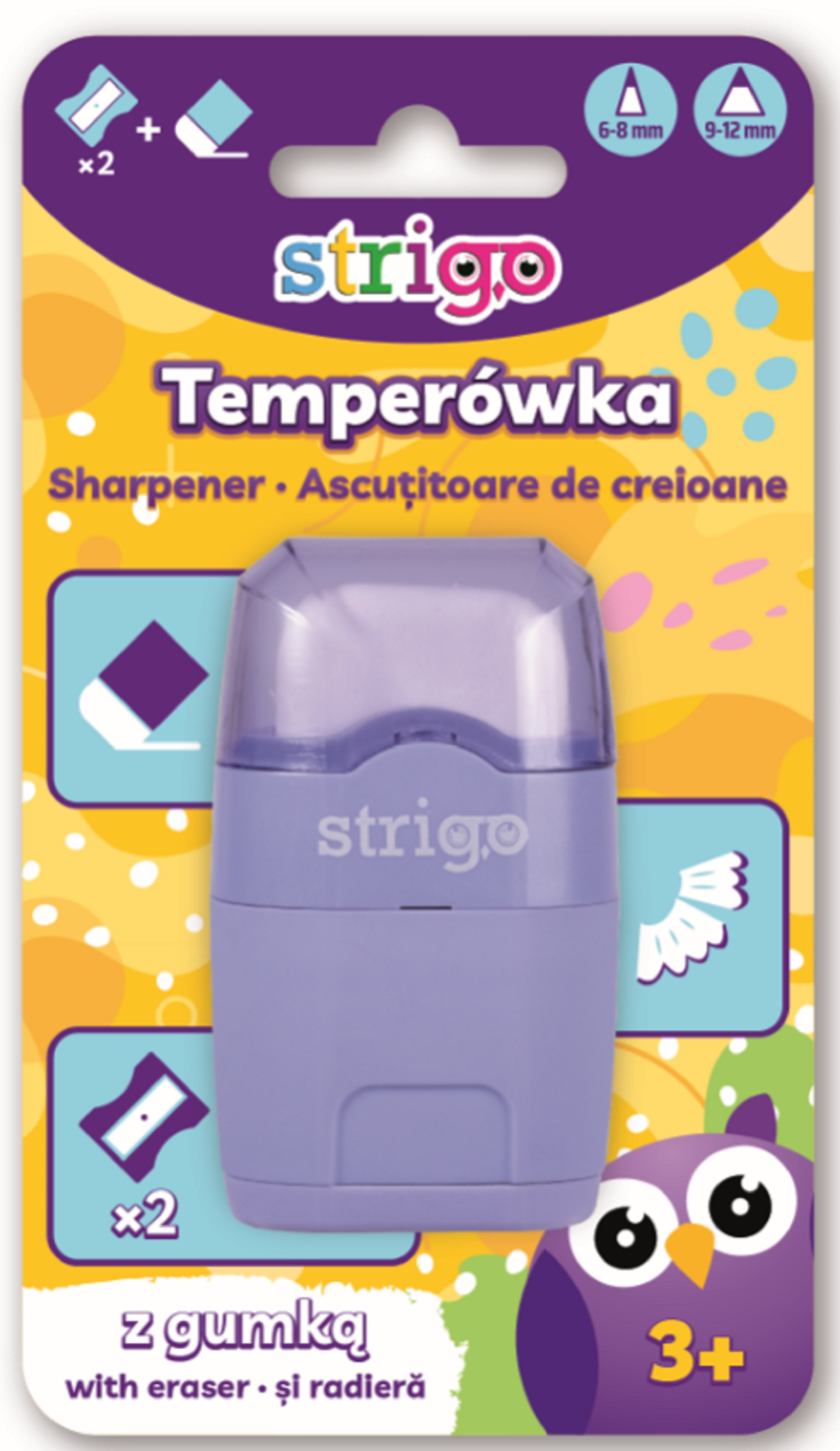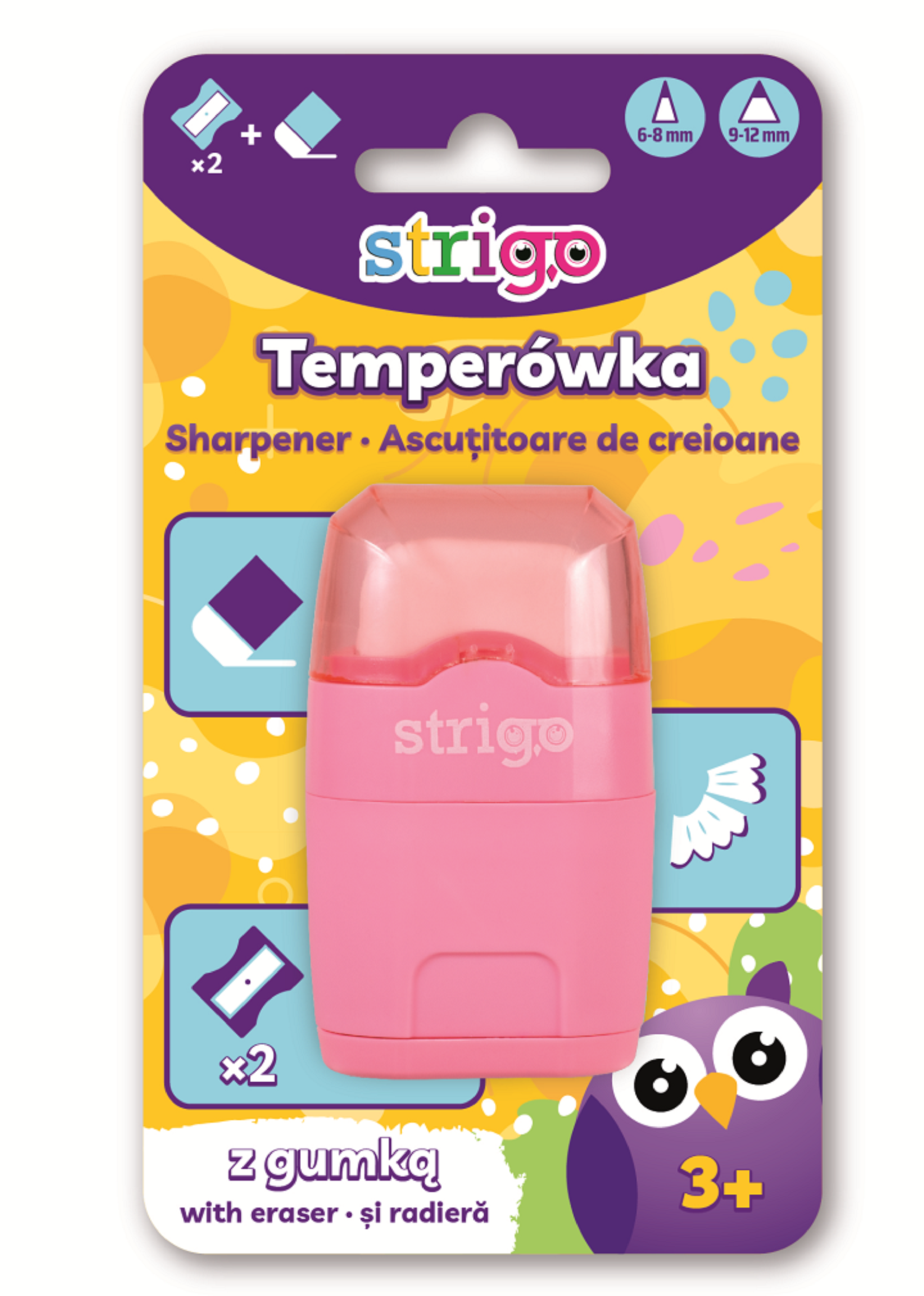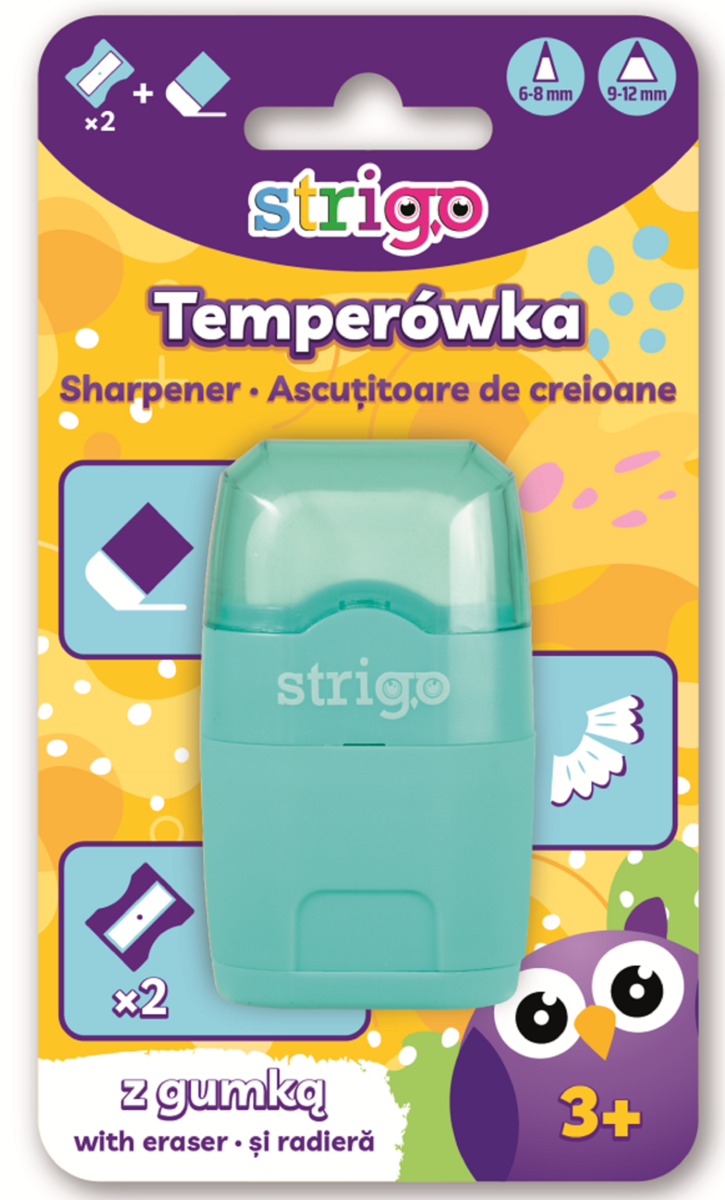 Ascutitoare Strigo prevazuta cu radiera. Dimensiuni ascutire: varf 6-8 mm si varf 9-12 mm.