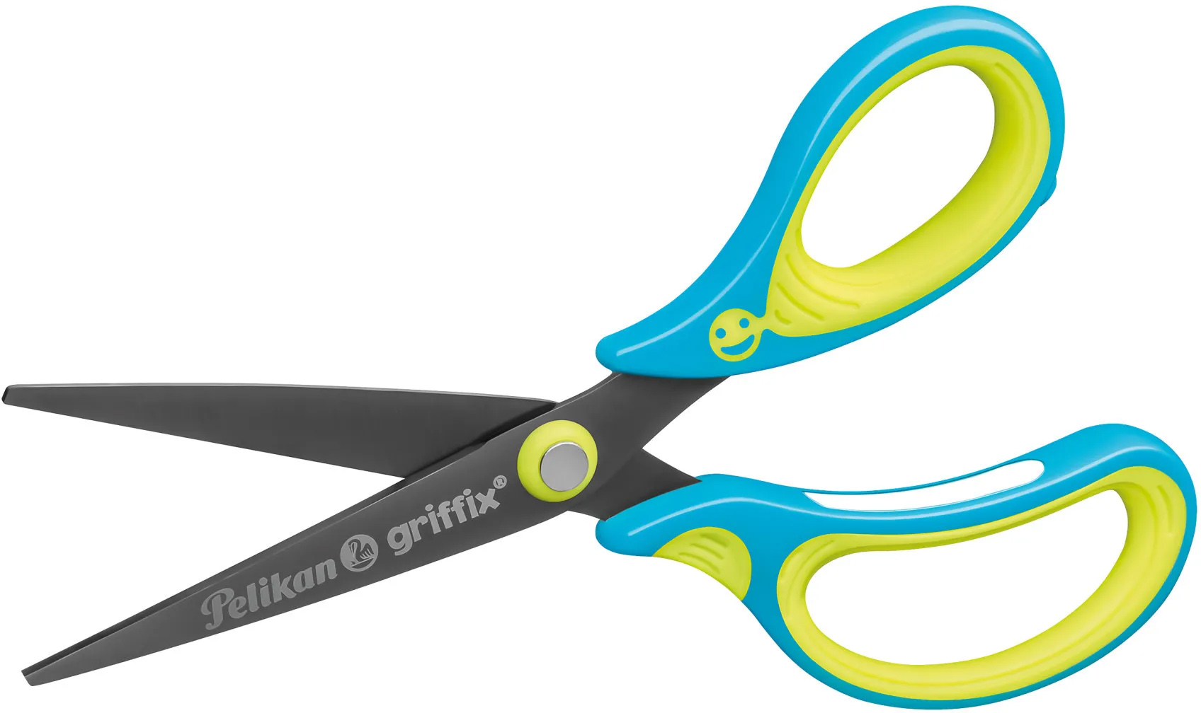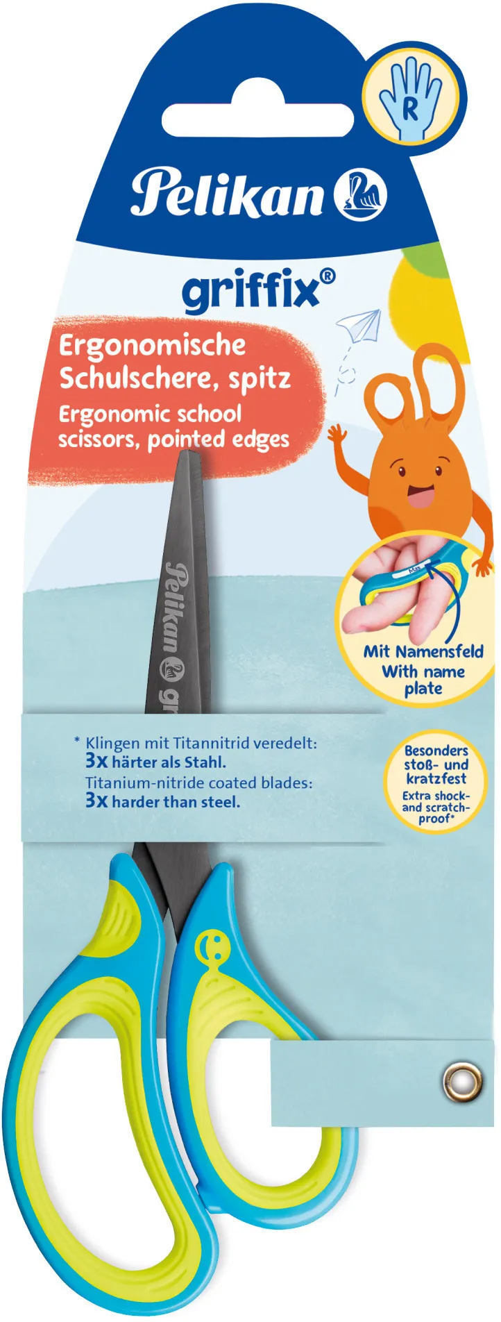 Foarfeca ergonomică pentru școală Pointed Griffix este de 3 ori mai rezistentă decât oțelul datorită stratului de nitrat de titan. Mânerul ergonomic este fabricat din plastic ABS de înaltă calitate și nu conține latex, asigură poziția corectă a mâinii și vine cu etichetă pentru nume.