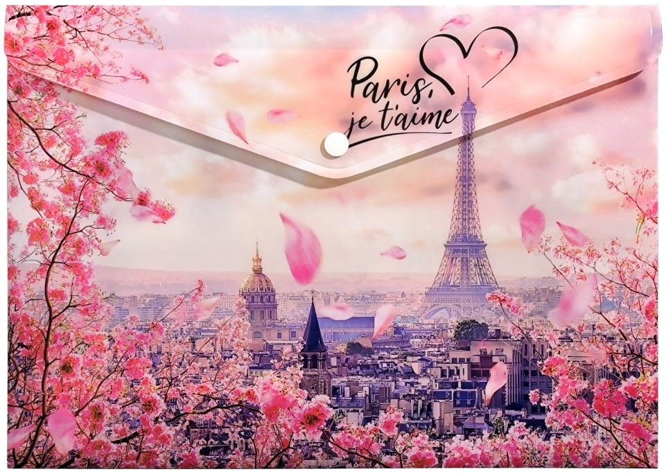 Mapă A4 din plastic cu buton, personalizată cu orașul Paris.Caracteristici:Clapă în VÎnchidere cu butonGrosime: 180 microniCapacitate: 120 coli