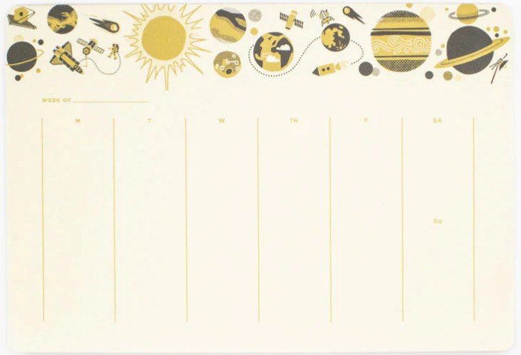 Păstrează-ți sarcinile importante, notițele și programul săptămânal cu acest planner inspirat din explorarea spațiului într-o grafică retro, astfel încât să-ți lași gândurile să călătorească prin sistemul solar, fără să pierzi din vedere ce ai de făcut.