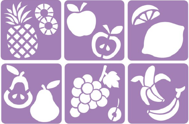 Setul conține 6 șabloane cu fructe, de 14 x 14 x 0.5 cm.