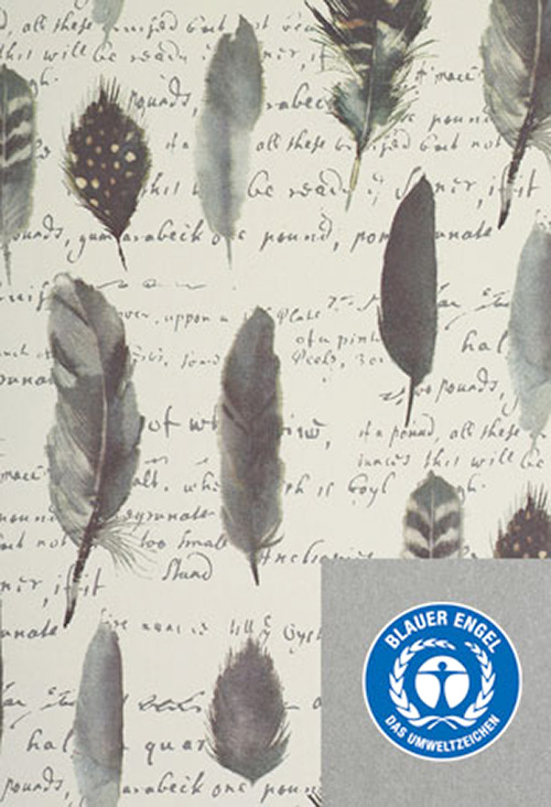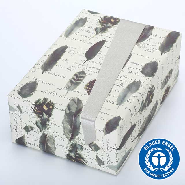 Hârtie de împachetat, două modele față/verso: caligrafie și pene / gri metalic.