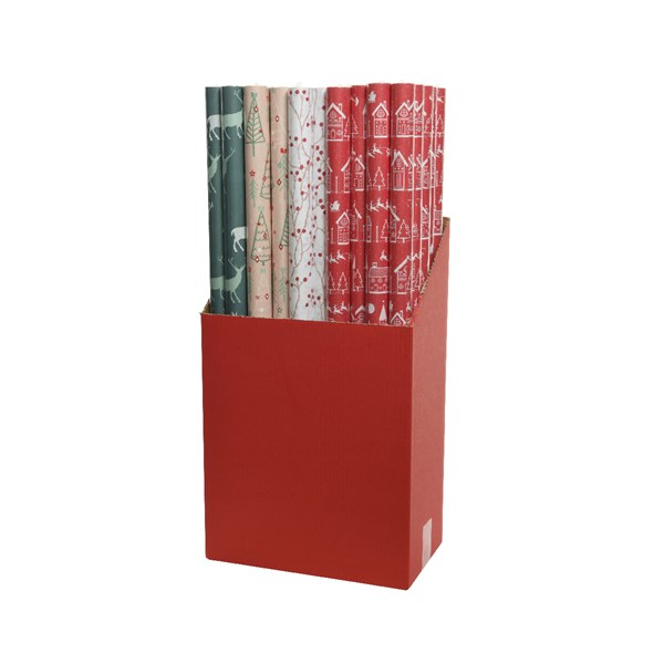 Hârtie de împachetat cu diverse modele: brăduț, casă, caprioară, fulgi de nea și fructe de pădure.