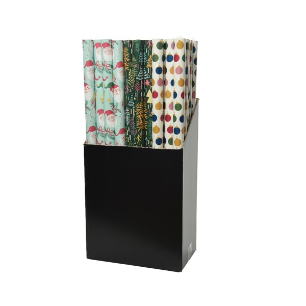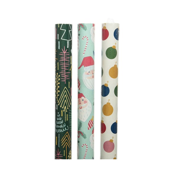 Hârtie pentru împachetat cu design divers: Moș Crăciun, brăduți, globuri colorate.