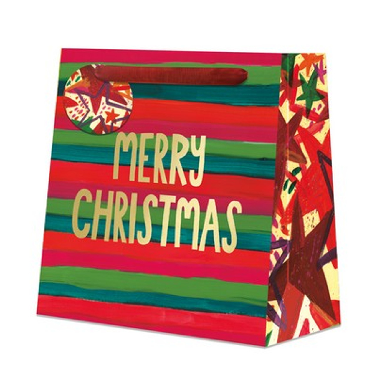 Punga cadou - Dungi rosii si verzi - Merry Christmas este perfectă pentru a oferi cadouri, cu ocazia acesei sărbători. Dimensiunile sale sunt de 22 X 22 X 8 cm, astfel încât va fi destul de încăpătoaare indiferent dacă vei vrea să oferi cadoul într-o cutie de protecție sau nu.
