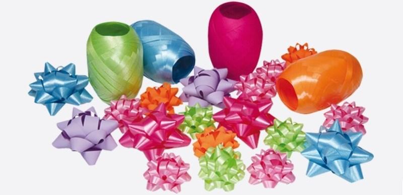 Set de 4 role de panglica pentru cadou cu lungimea de 20 de metri si 18 funde pentru cadou, in culori asortate.