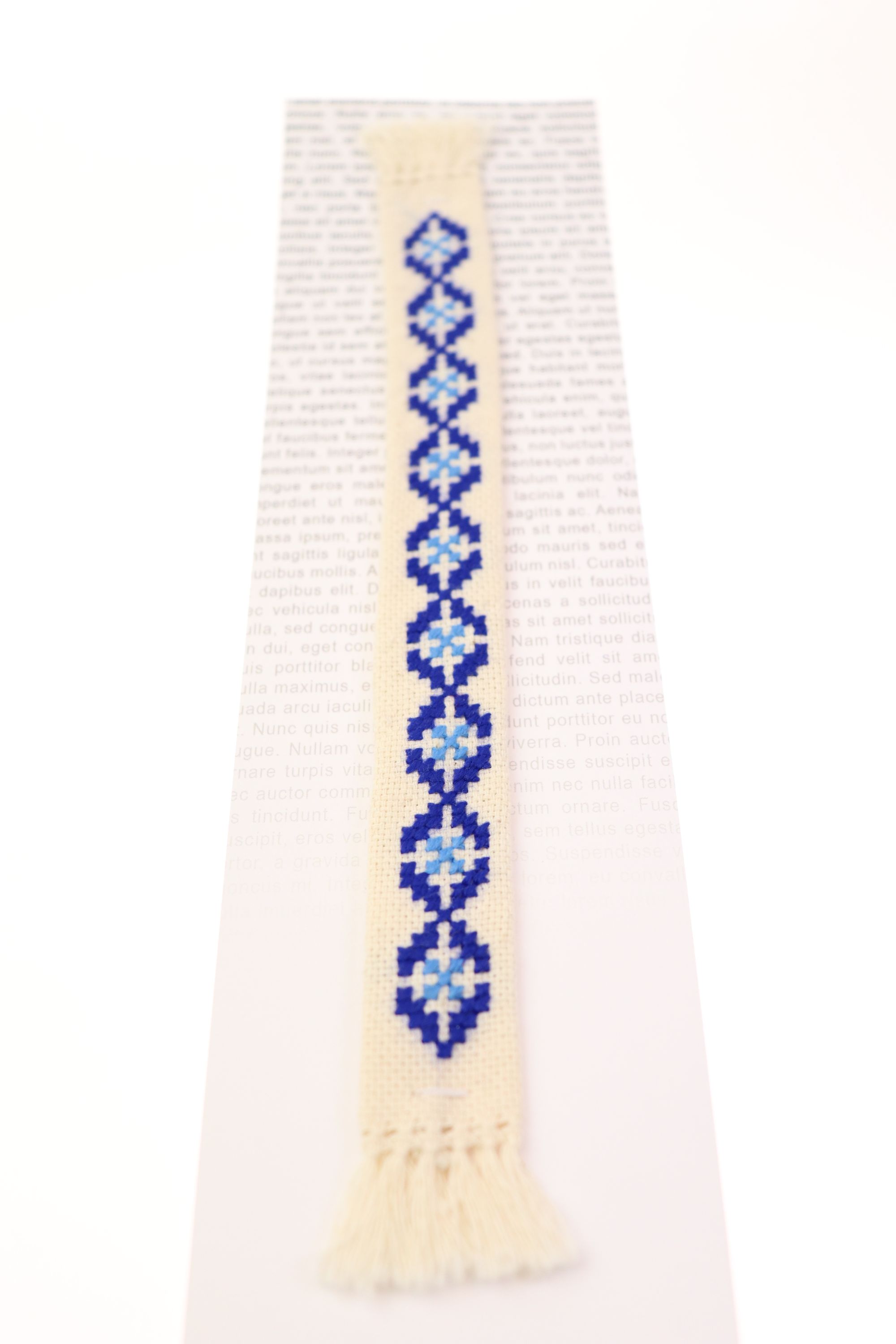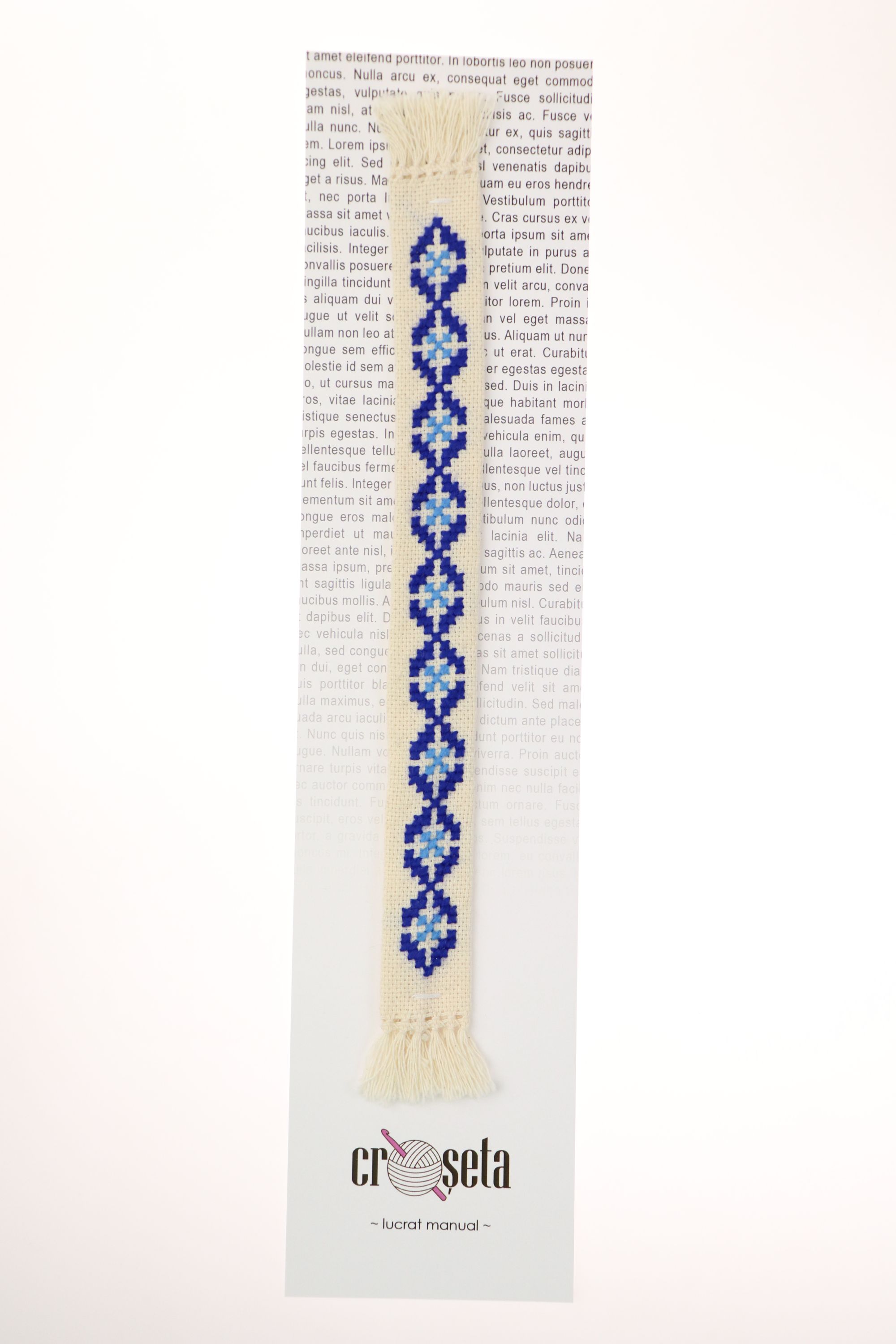 Semn de carte cusut manual cu motive tradiționale geometrice, pe pânză matador, 100% bumbac neted.