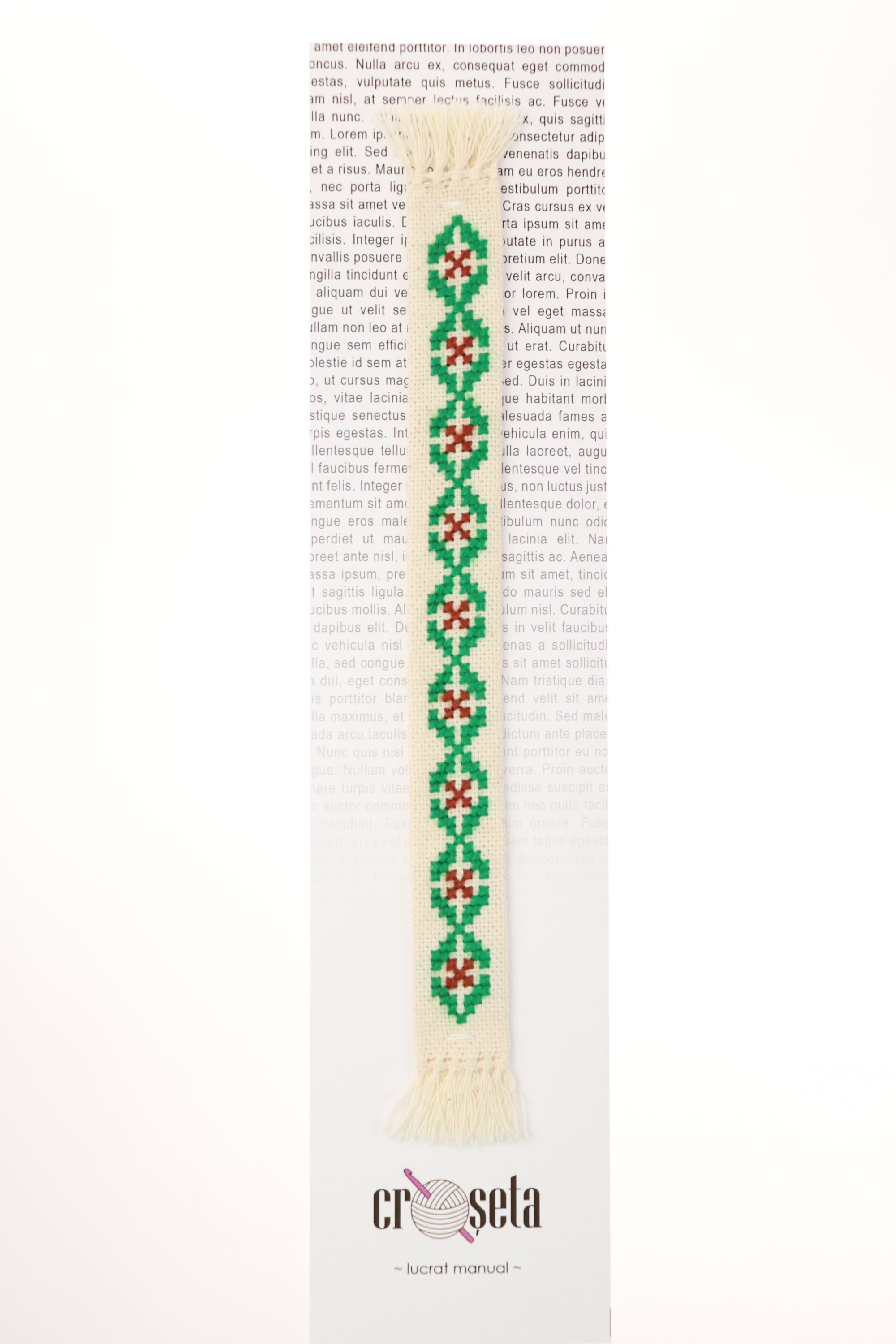 Semn de carte cusut manual cu motive tradiționale geometrice, pe pânză matador, 100% bumbac neted.