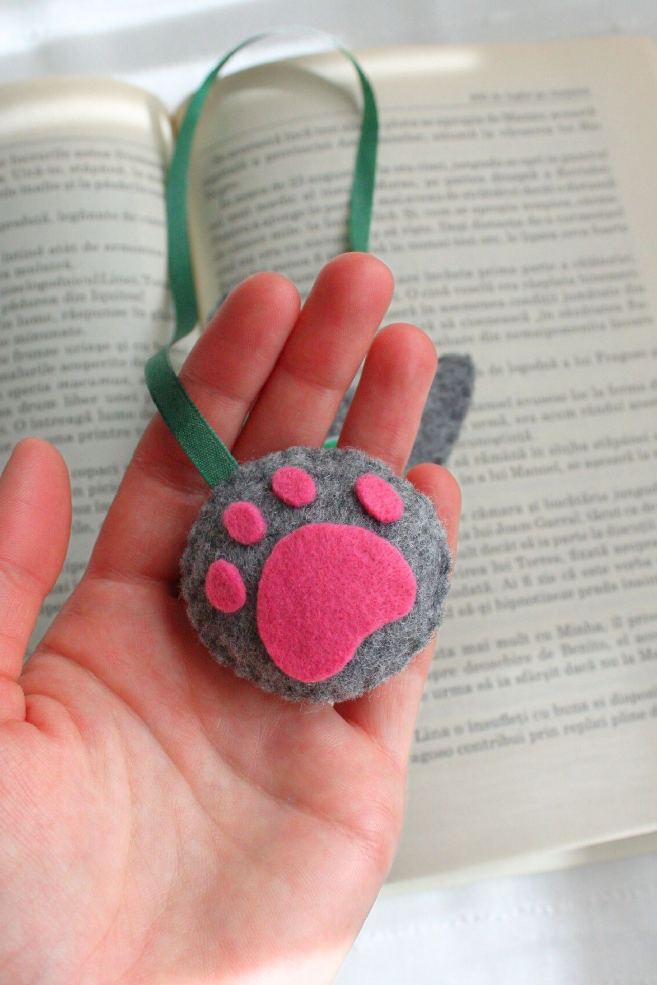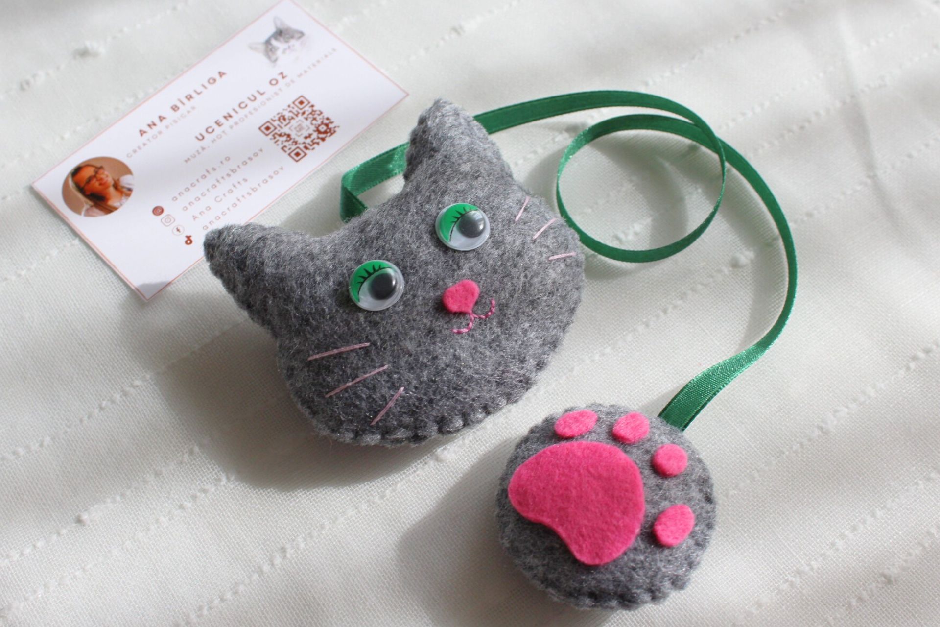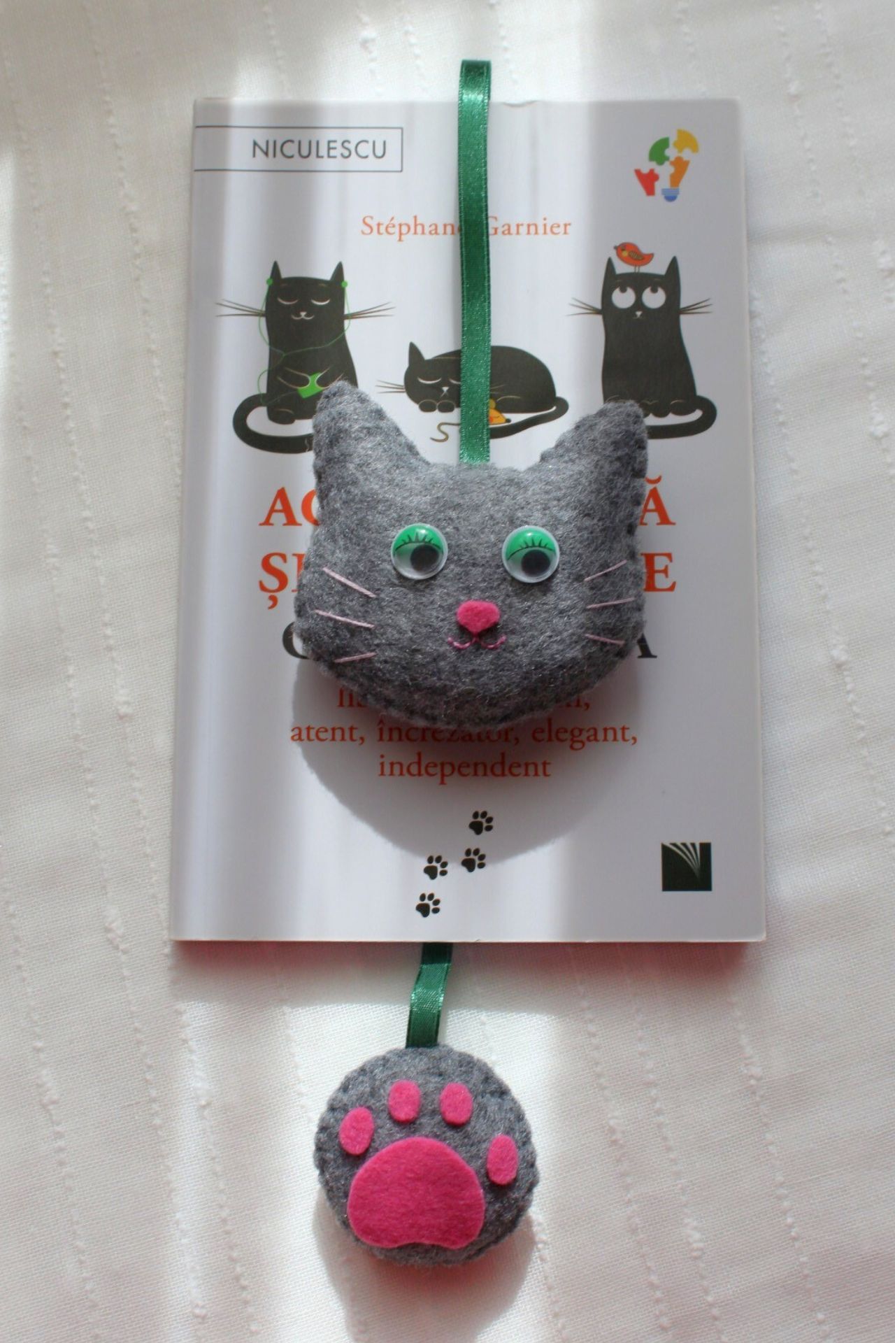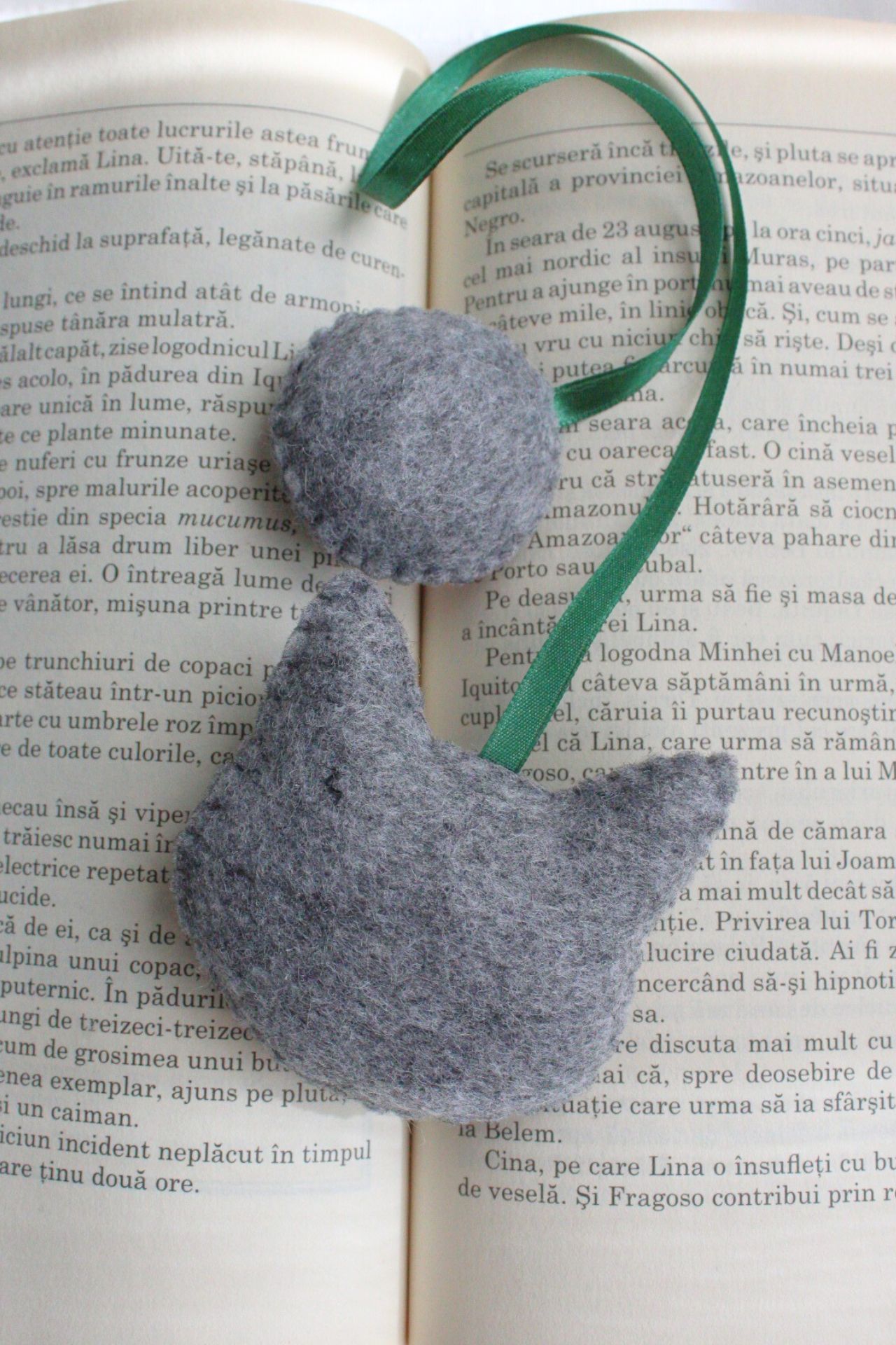 Semn de carte cusut manual din fetru. Ochii sunt mobili din plastic. Fiecare reproducere nu poate fi 100% exactă, existând mici variațiuni de la un produs la altul.