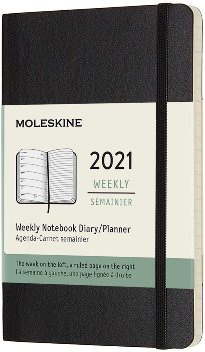 The 12-Month Weekly Notebook Diary/Planner in classic black balances week-by-week planning with note-taking. Each two-page spread shows the days of the week on the left, opposite a ruled page for notes, to-dos and random thoughts on the right. Dated from January to December 2021, this practical layout lets you see the whole week at a glance, while also providing the space and freedom of a notebook.