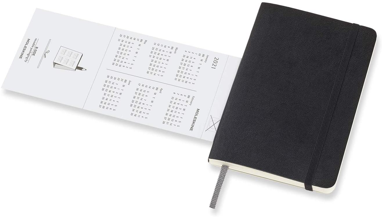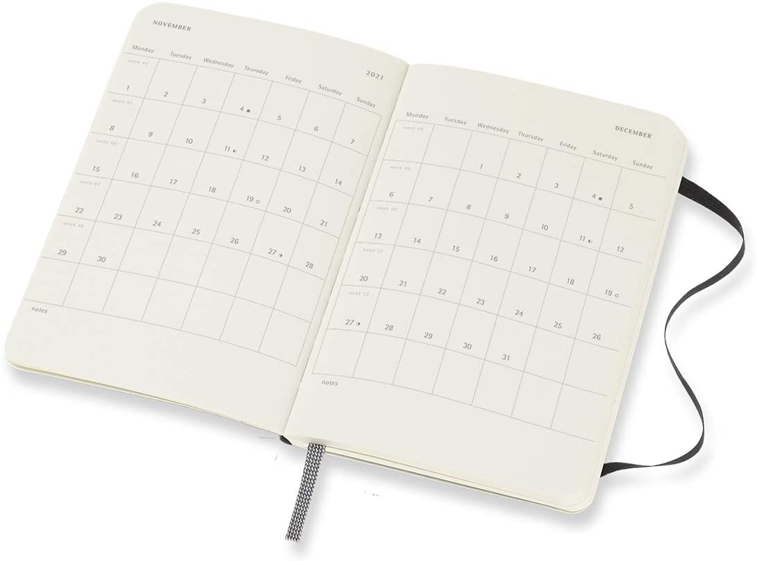 A black elastic closure across the front cover holds everything together, allowing you to tuck loose notes between the pages – as well as in the expandable pocket in the back. The matching bookmark ribbon takes you directly to the right week every time, while gently rounded corners protect your planner against wear and tear as you move about your day.