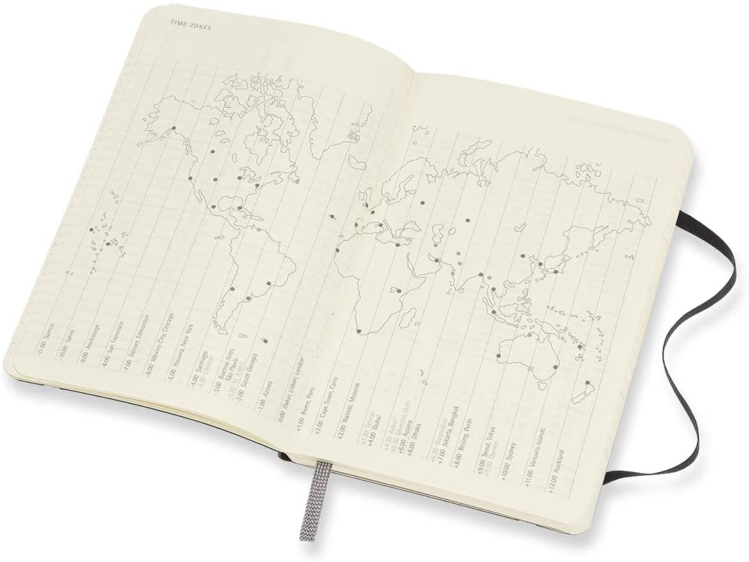 The opening pages of the 12-Month Weekly Notebook Diary/Planner feature an ‘In case of loss’ notice to customize with contact details and a reward, along with a Personal Data section to complete with any key info you might need on the move. Yearly and monthly snapshot pages provide a broad overview of 2021, followed by useful information for travel planning – from international time zones to dialing codes and a map to log your journeys.