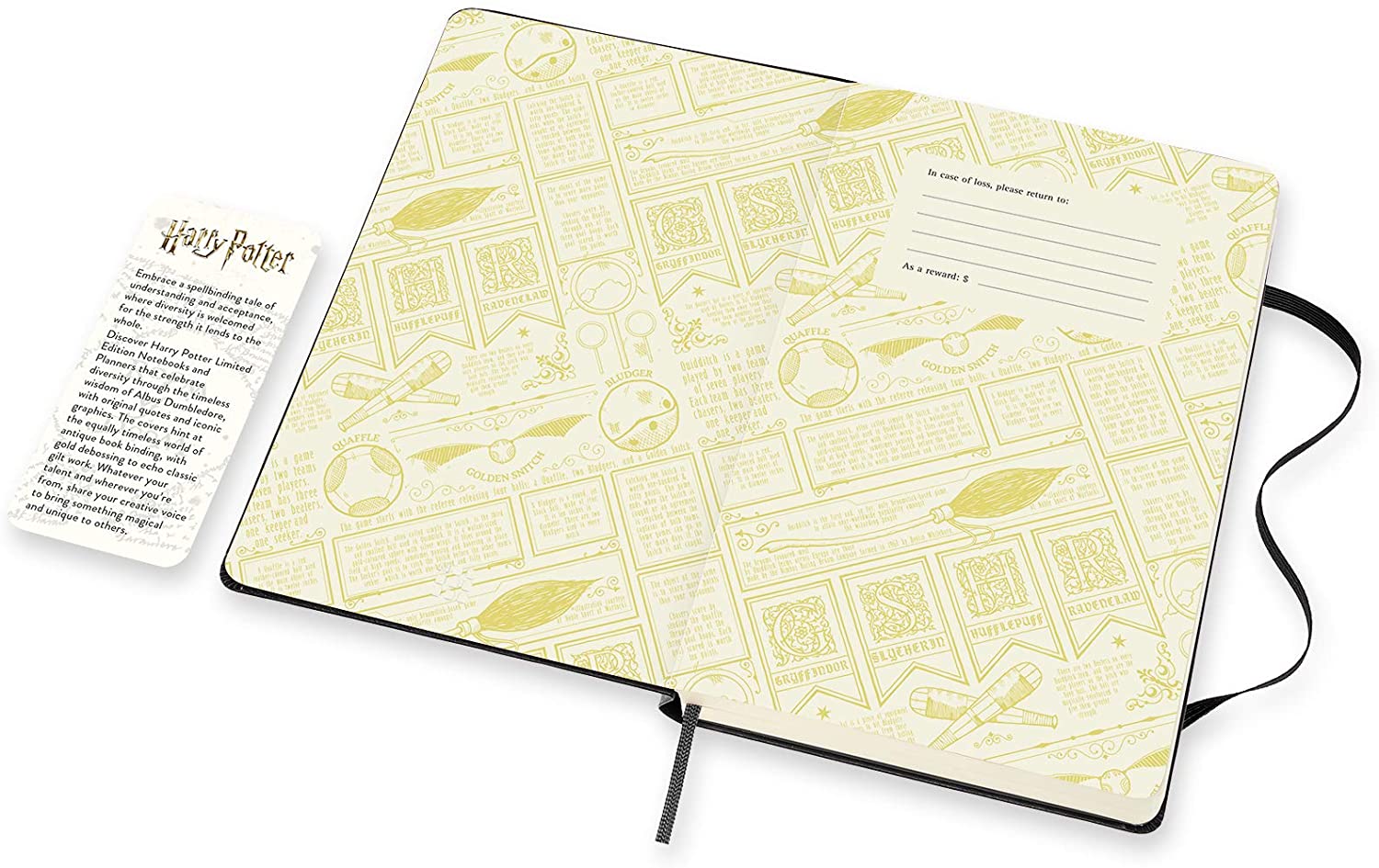 The aspect of each planner in the collection echoes the world of antique bookbinding, in this case with the Golden Snitch delicately debossed in gold on the cover. The opening and closing pages are bursting with information about Quidditch, while the paperband B-side can be transformed into your very own wand. The themed story card inside makes a neat bookmark and the assortment of Harry Potter gold stickers are a fun way to customize your notes and plans.