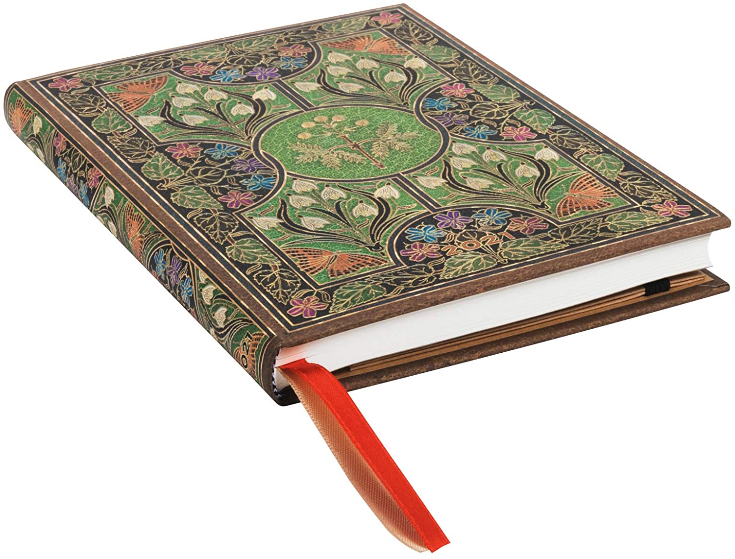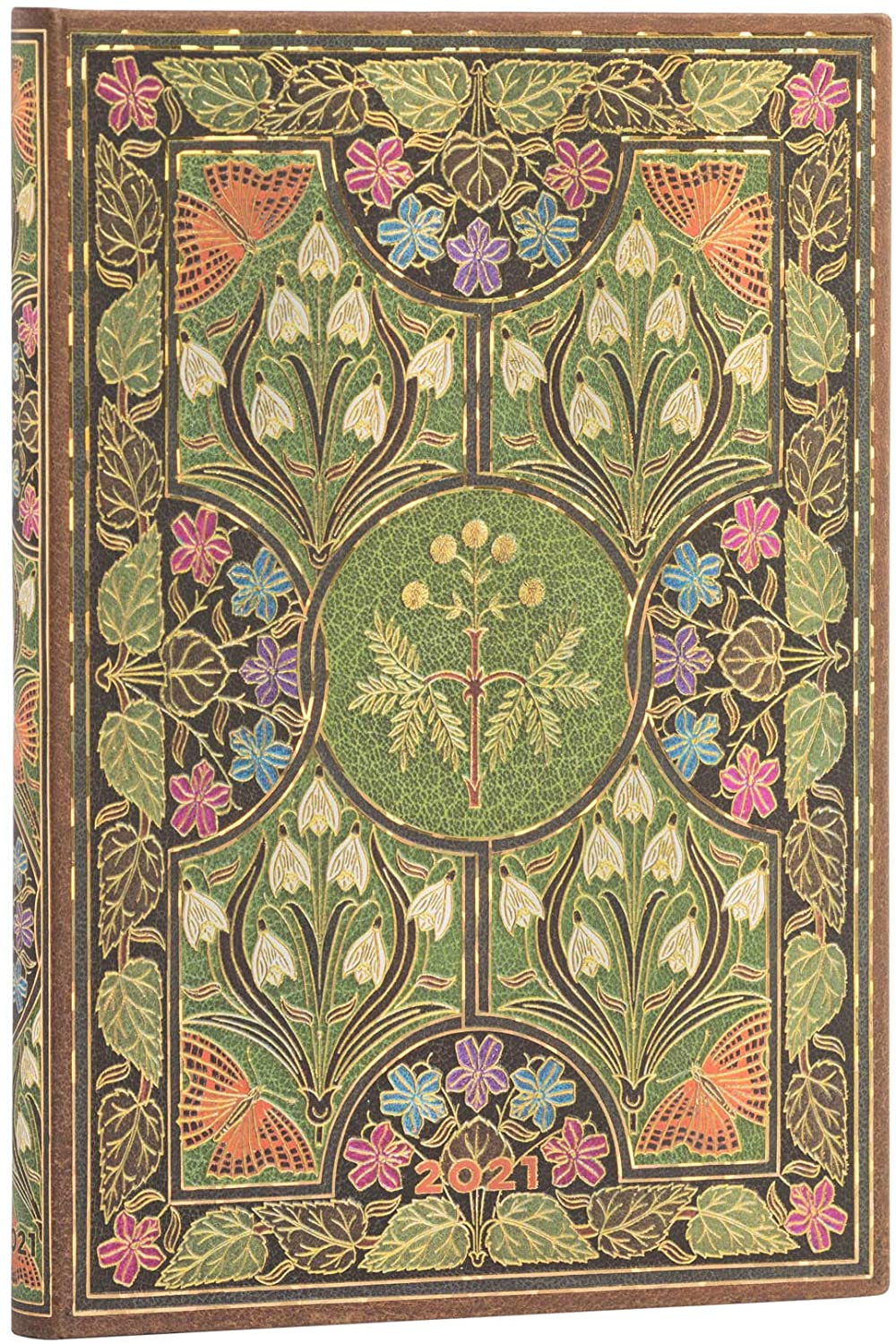 Unlike most of our designs, which emulate the front part of a book cover, this Poetry in Bloom design is a recreation of the original’s front “doublure,” the inside face of the cover board. Protected from wear, this part provides bookbinders with additional room for unleashing their creative skills. Here, the binders of Riviere and Son, a London-based binding house, used leather and gilt to create a naturalistic representation of flowers, leaves and butterflies. The sensitive plant, named after its reflex to fold its leaves when touched or shaken, is the focal point of the design’s composition, just as it is in Shelley’s poem.