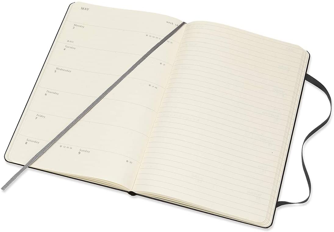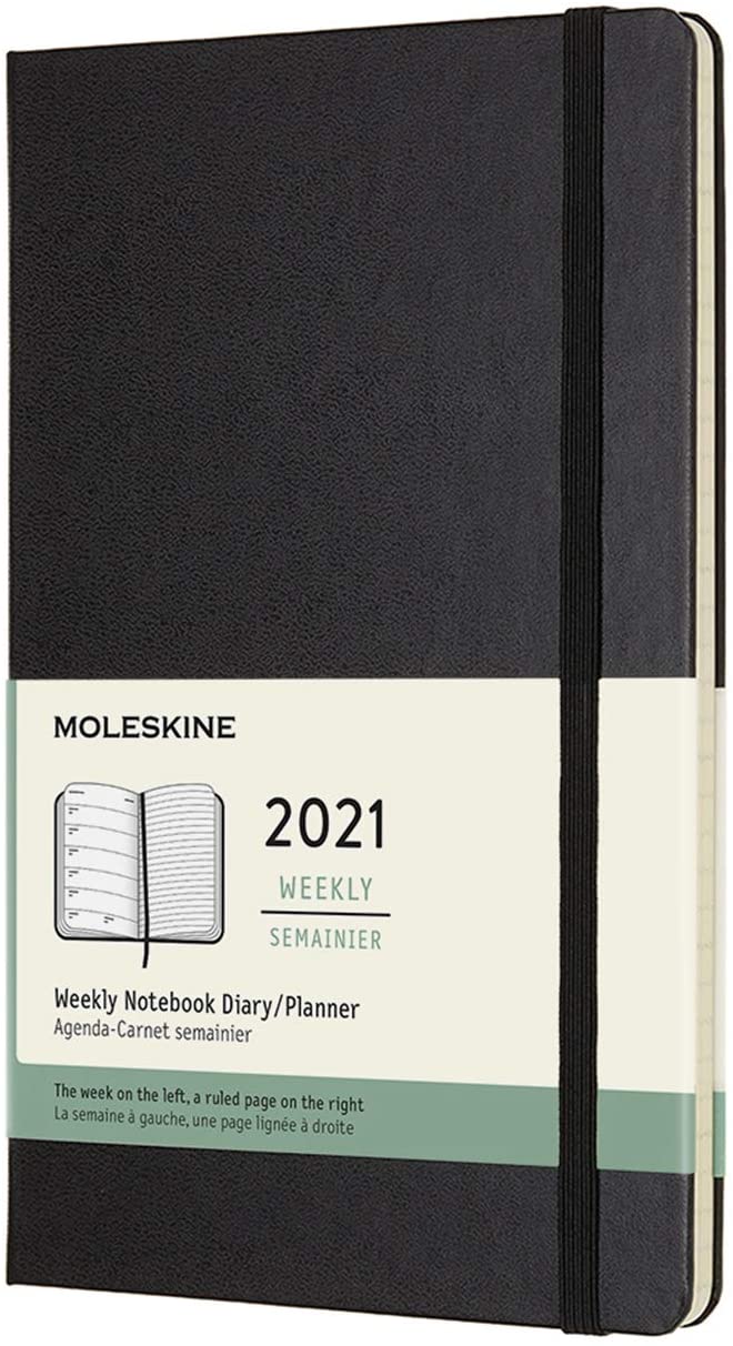 The 12-Month Weekly Notebook Diary/Planner in classic black balances week-by-week planning with note-taking. Each two-page spread shows the days of the week on the left, opposite a ruled page for notes, to-dos and random thoughts on the right. Dated from January to December 2021, this practical layout lets you see the whole week at a glance, while also providing the space and freedom of a notebook.