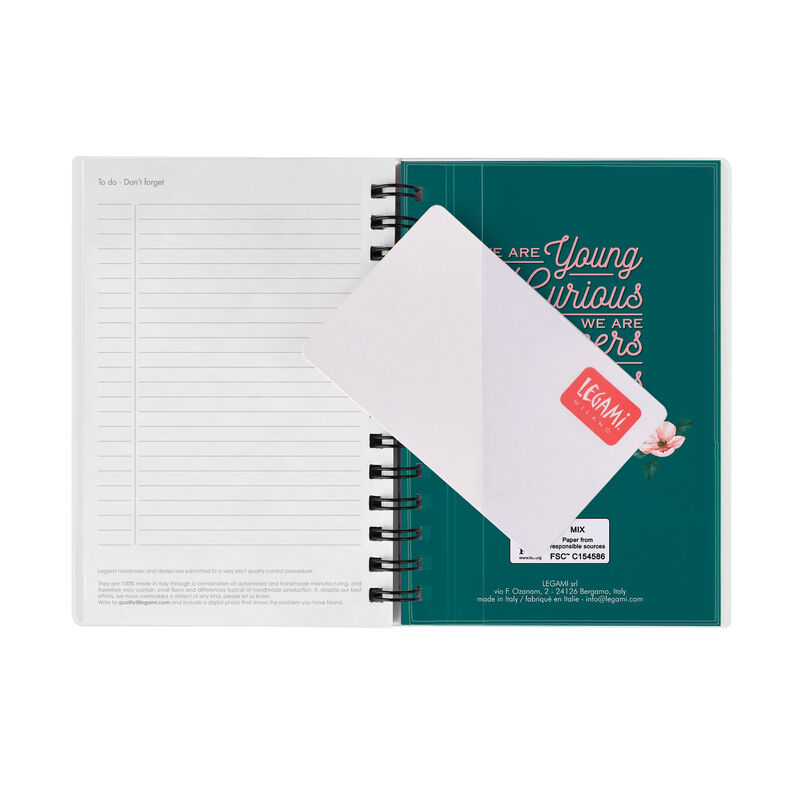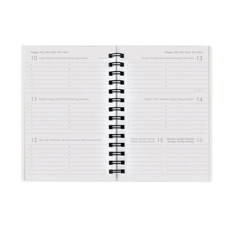 Această agendă săptămânală de mărime mică, este prevăzută cu o liniatură specială și este concepută pentru a vă planifica cu ușurință fiecare zi. Legătura acesteia este de tip spirală, astfel agenda se poate deschide până la 360 de grade. Coperta viabilă este confecționată din materiale de calitate și închiderea se face cu elastic. Foile sunt rezistente, au o greutate de 70 g/mp și sunt prelucrate din surse forestiere certificate, FSC.