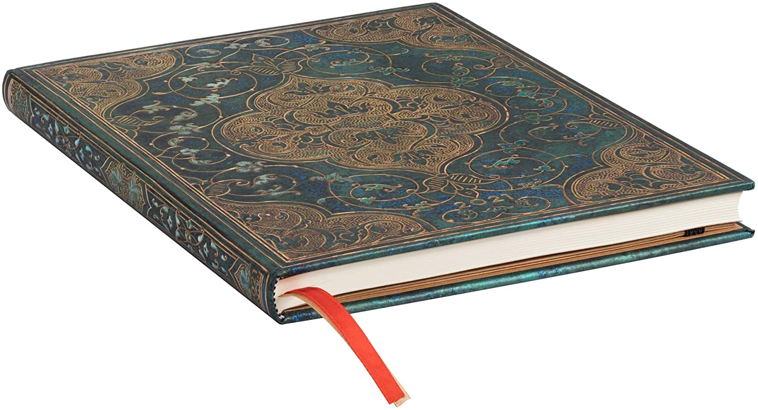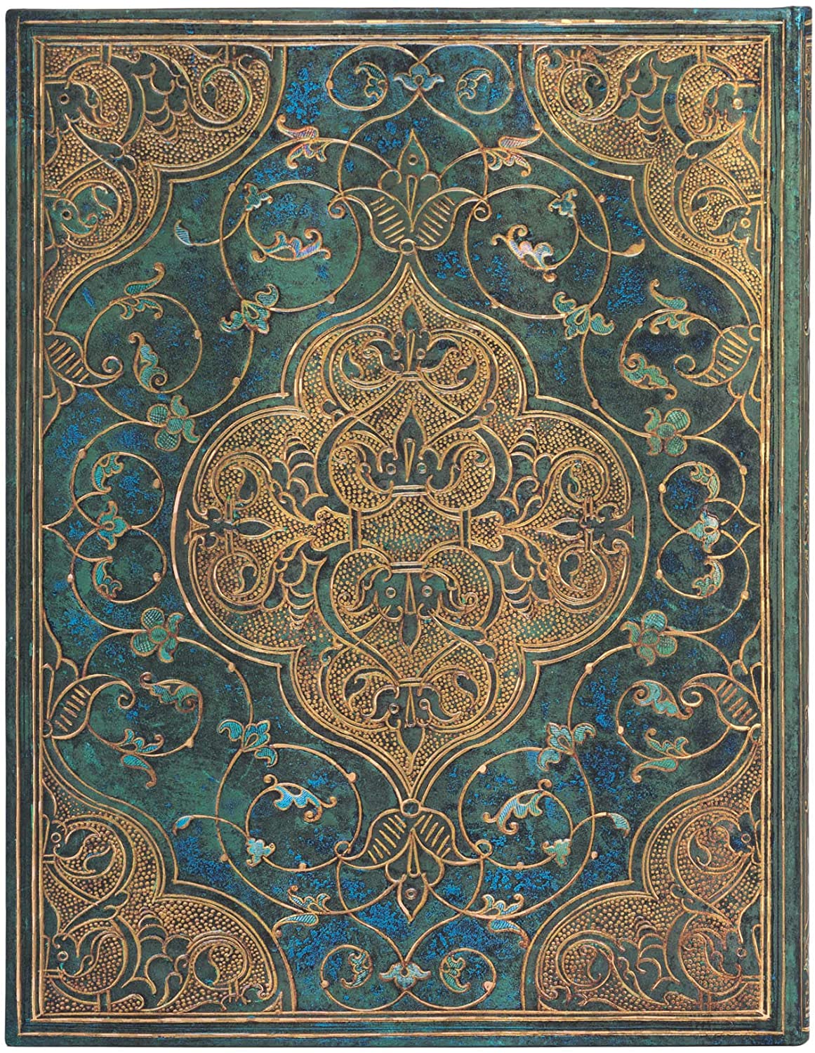 This cover is based on the binding for a book titled Chroniques, published by Salel Binder in Paris in 1514. The exuberance of the design reflects the splendour of the Renaissance approach to decoration. In this green-blue journal cover you may see the intricacies of your own stories.