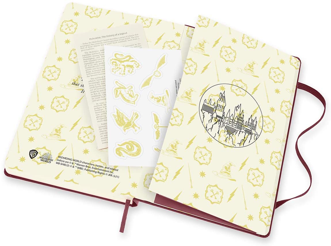 The instantly-recognizable themed graphics continue on the notebook endpapers, which are crammed with information about Quidditch. The quote from the back cover is reprinted on the last page, alongside a stylized image of Hogwarts. Once opened, you can transform the paper band B-side into a magic wand, while you'll find Harry Potter stickers and a themed story card tucked inside the notebook.