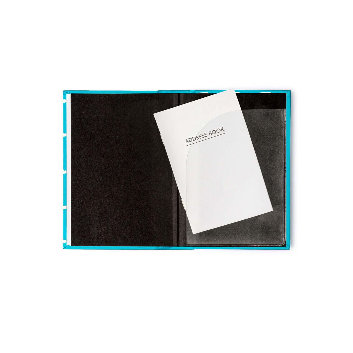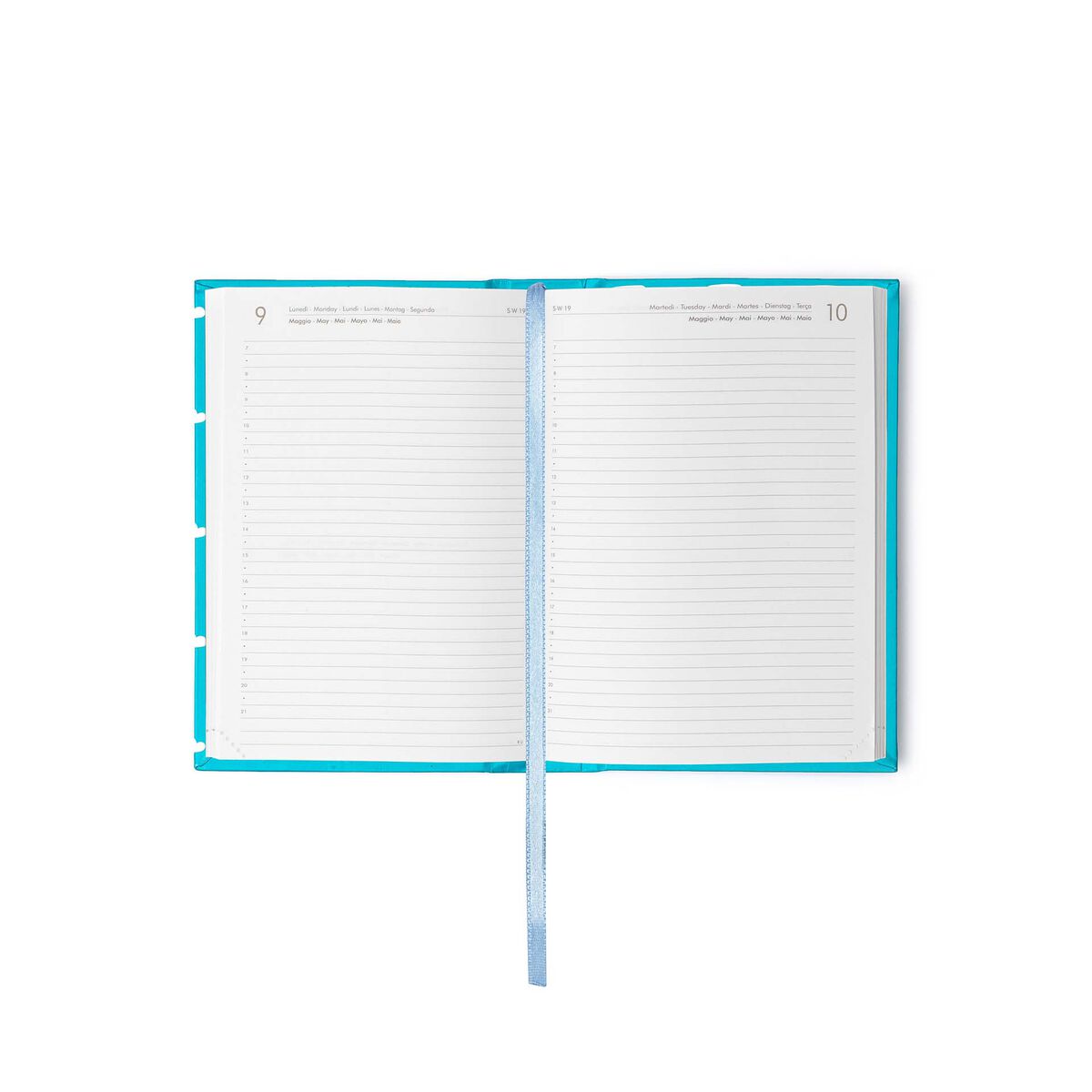 Agenda dispune de închidere cu elastic, semn de carte din panglică, colțuri perforate și buzunar din PVC în partea din spate pentru diferite documente.