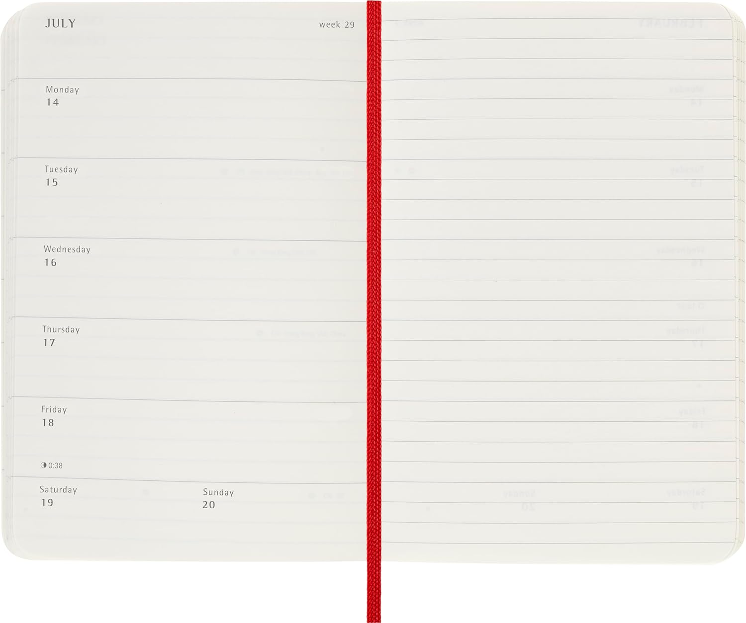 • The pack includes a 18-month weekly planner with a soft cover available in Pocket size 9 x 14 cm and in scarlet red, and stickers to customize the planning