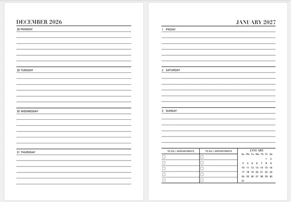 • Toate agendele cu organizare saptamanala vin cu o copertă și un calendar pentru anul 2026.
