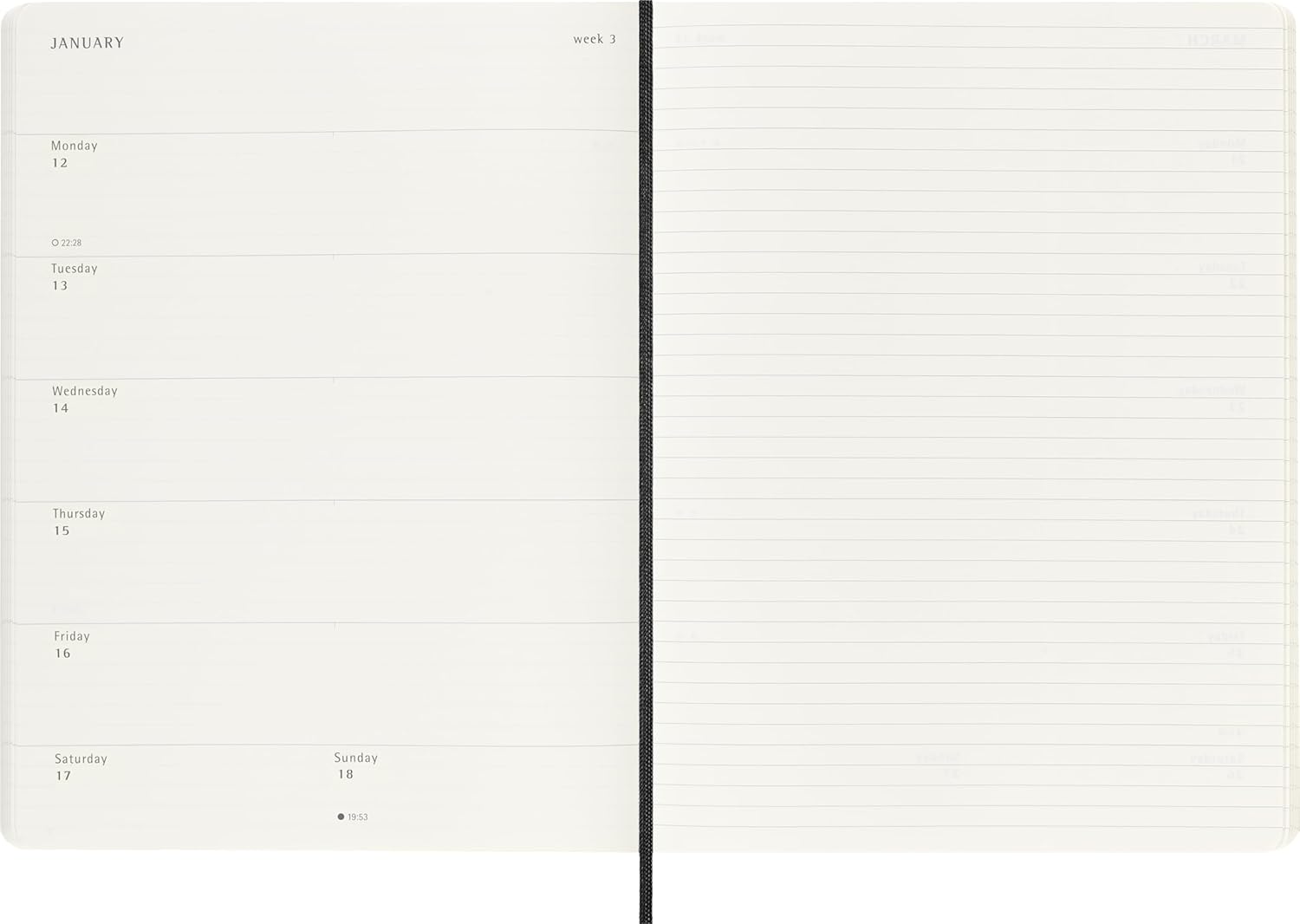 • WEEKLY LAYOUT: on the left you will find a page with the days for the week's appointments and, on the right, a lined page for taking notes and organizing ideas.