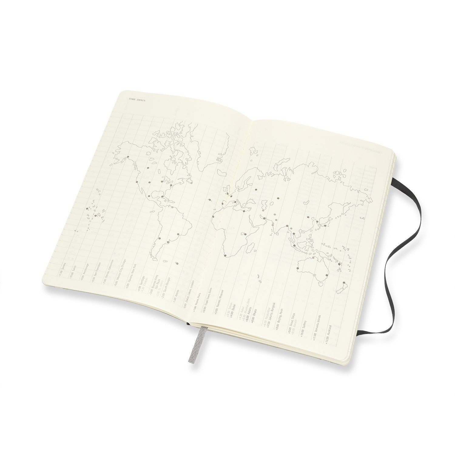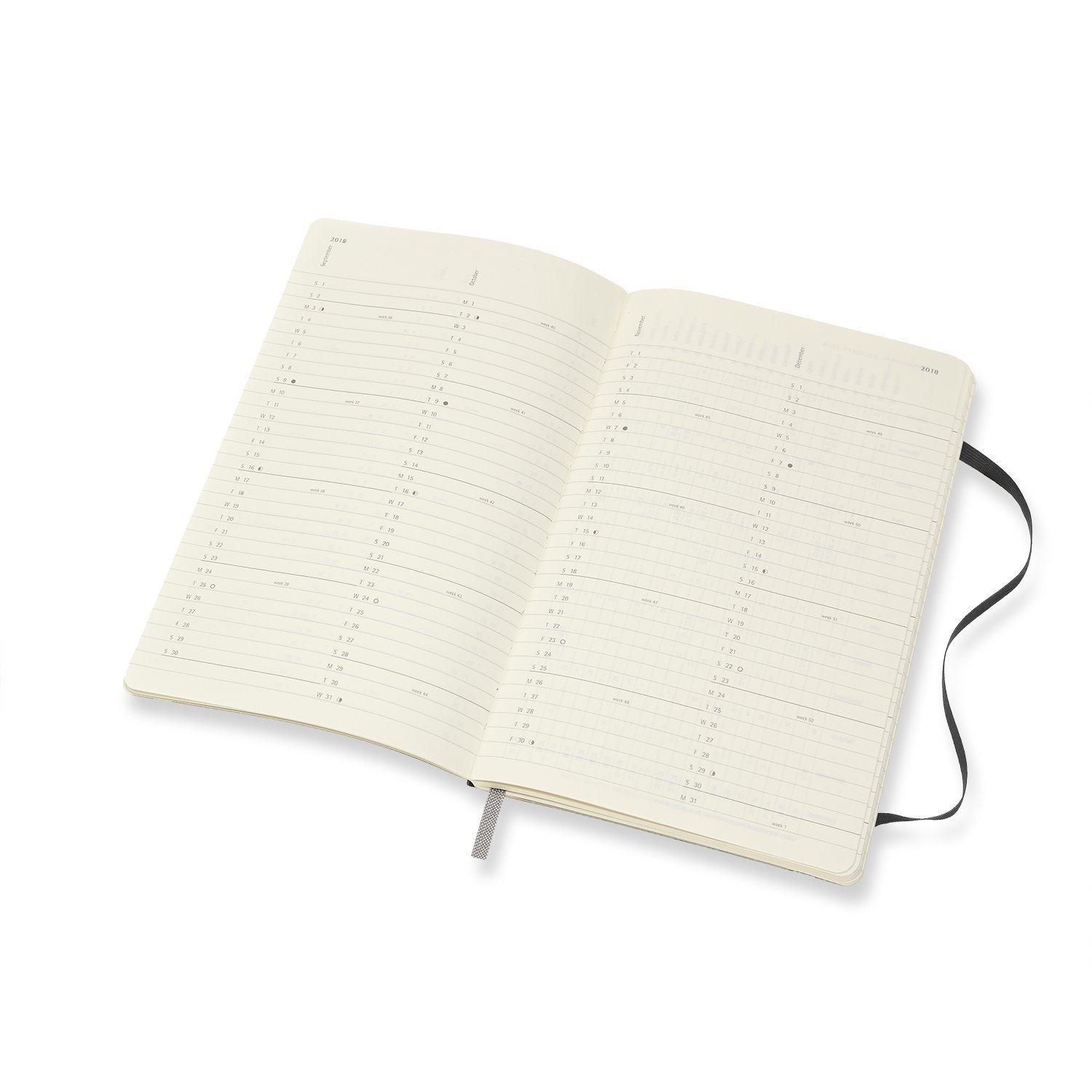 Moleskine's 2018 12-month monthly notebook diary covers the period from January 2018 through December 2018. It features acid-free pages, a soft cover with rounded edges, elastic closure and ribbon bookmark. The monthly diary features a monthly layout on two pages followed by ruled pages for notes.