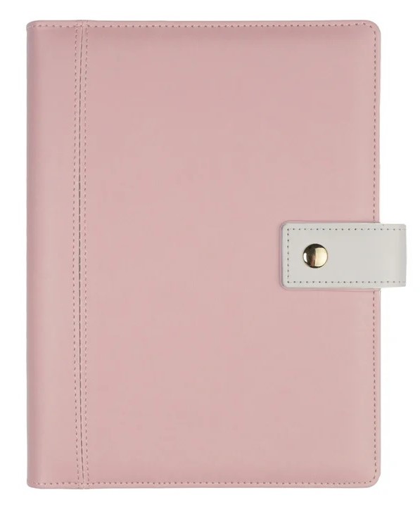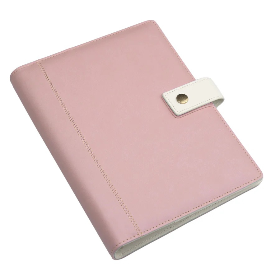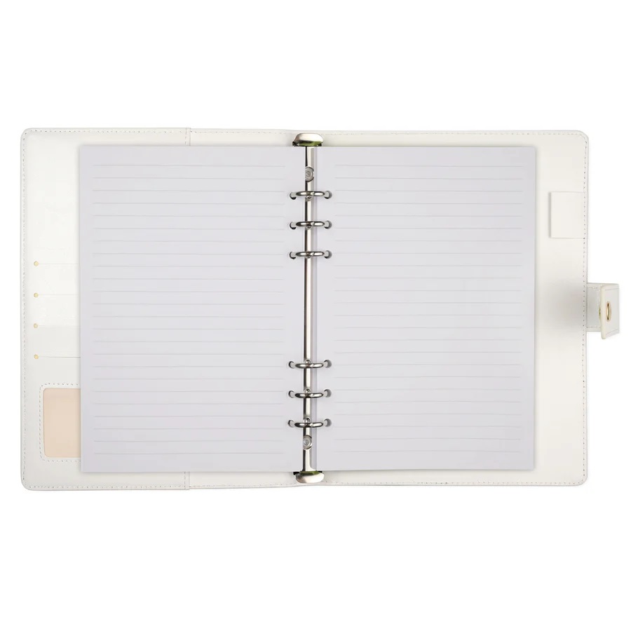 Cu o copertă din piele ecologică fină la atingere, închidere prin capsă și inele argintii rezistente, este o combinație perfectă între design frumos și practic. Conține 4 buzunare mici în interior, un buzunar mare și un suport pentru instrumente de scris, astfel încât să puteți păstra hârtii, bilete, carduri, autocolante, pixuri și multe altele.