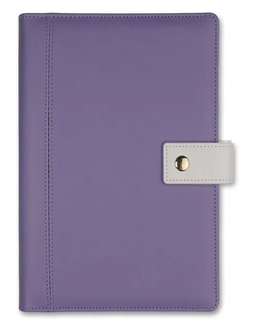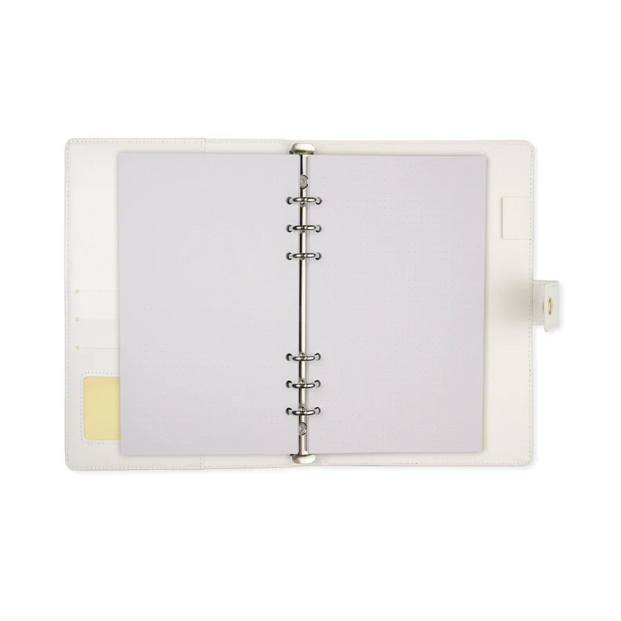 Cu o copertă din piele ecologică fină la atingere, închidere prin capsă și inele argintii rezistente, este o combinație perfectă între design frumos și practic. Conține 3 buzunare mici în interior, un buzunar mare și un suport pentru instrumente de scris, astfel încât să puteți păstra hârtii, bilete, carduri, autocolante, pixuri și multe altele.