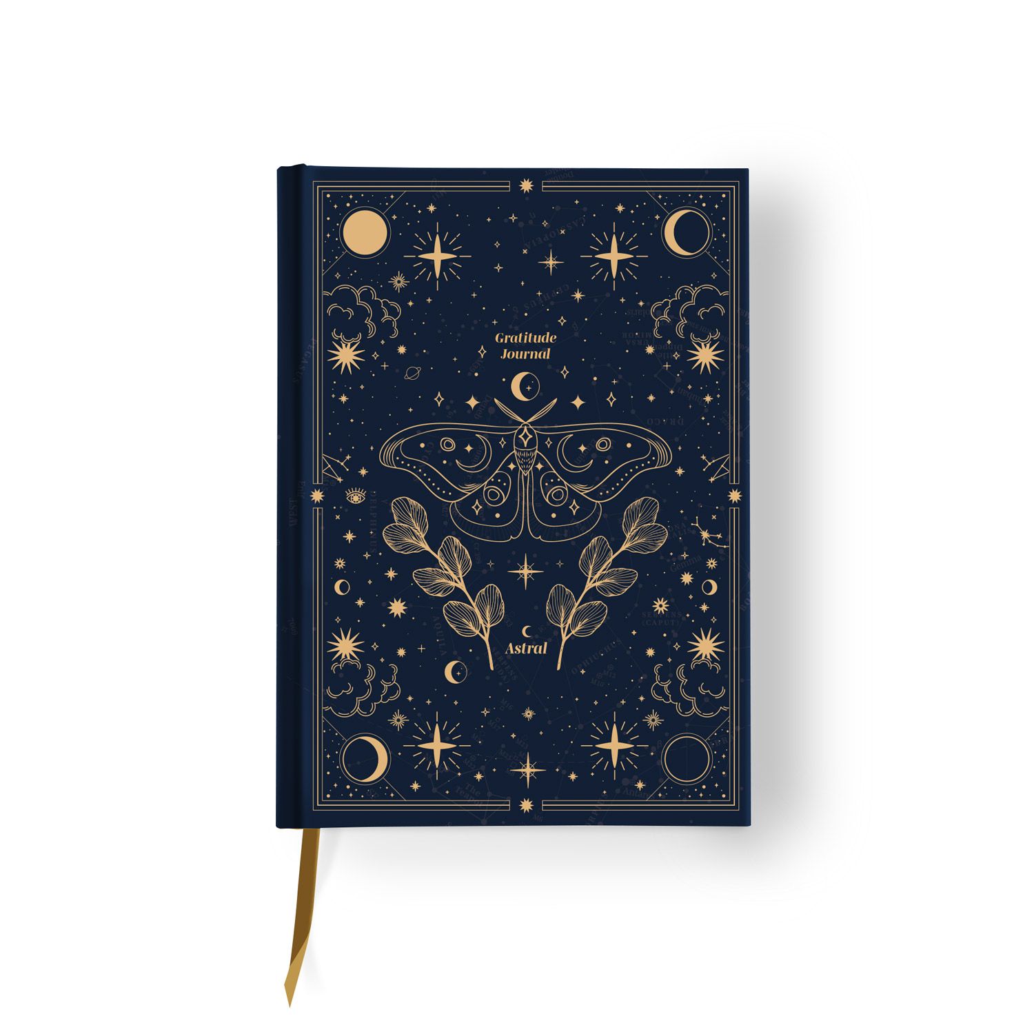 Jurnal - Astral Gratitude format A5 cu legare prin lipire și copertă cartonată. Conține 176 de pagini și este realizat din hârtie crem de 100 g/m². Include un separator cu panglică și colțuri pătrate.