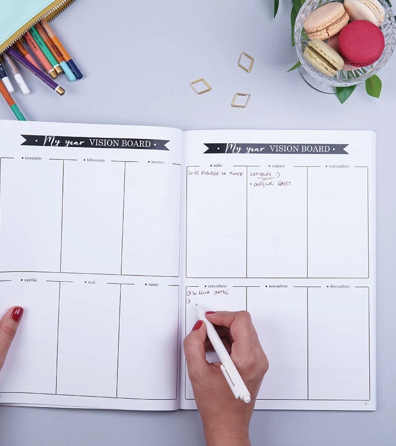 • 2 pagini - My year Vision Board e locul in care iti poti imparti proiectele pe luni, in asa fel incat sa te organizezi eficient, asigurandu-te ca nu ai perioade in care te supra-aglomerezi;