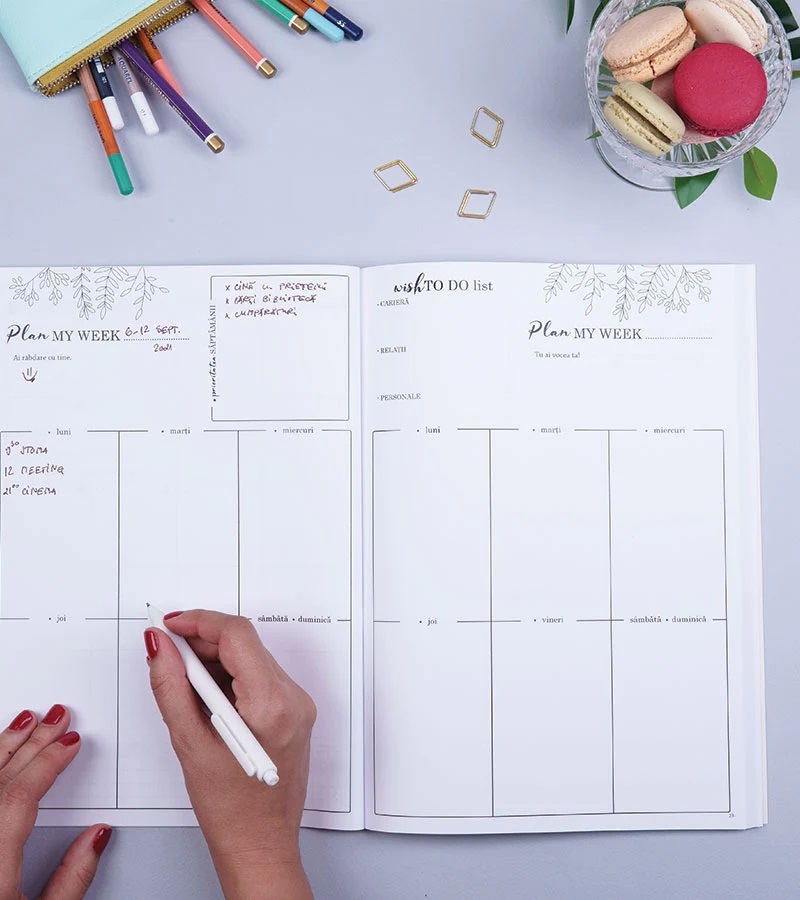 • 52 de pagini Weekly Planner - organizare saptamanala (cate o saptamana pe fiecare pagina);