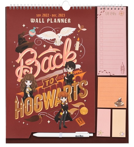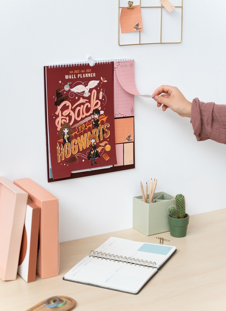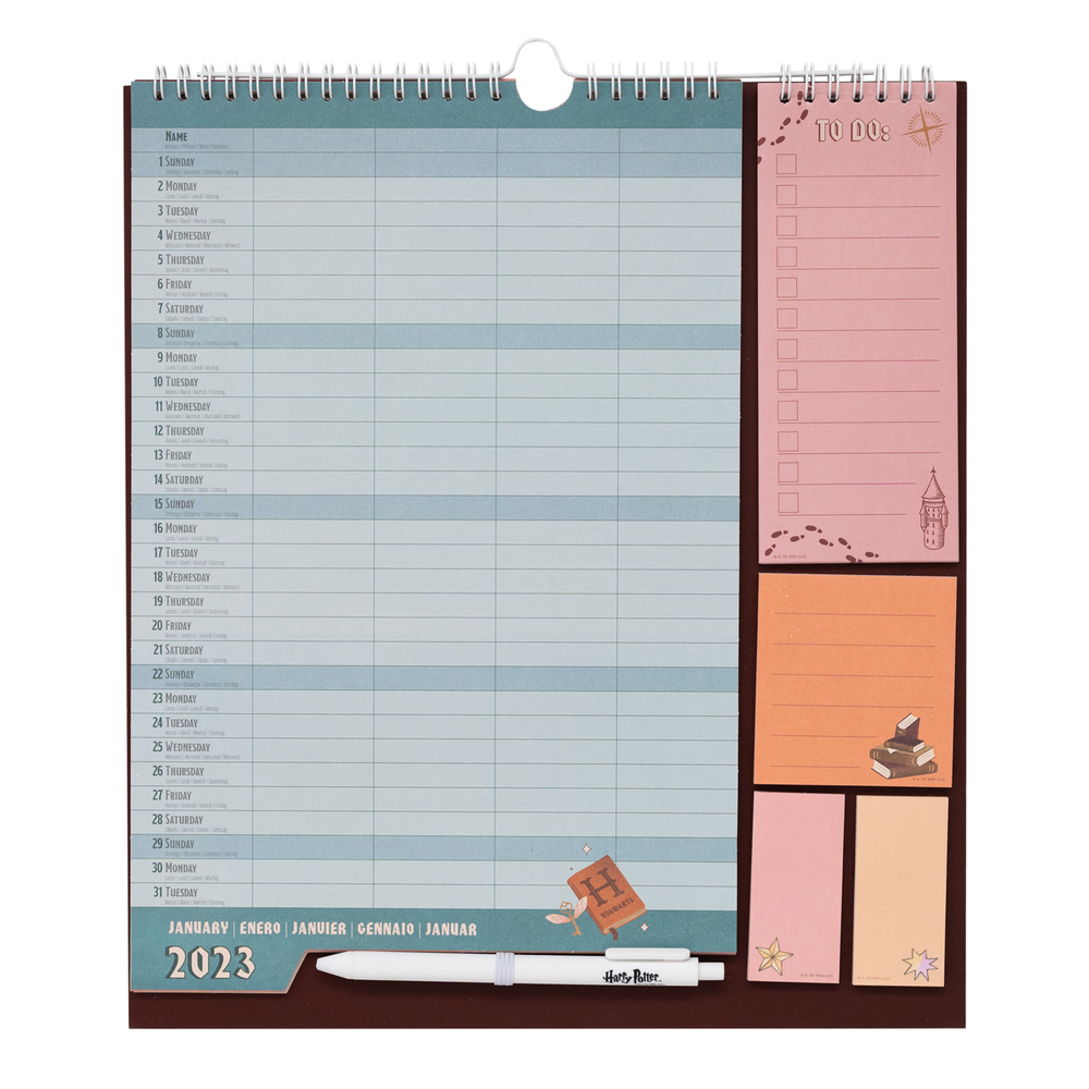 Planner lunar din septembrie 2022 până în decembrie 2023, cu spațiu pentru note organizate pe coloane. Include 1 blocnotes, trei blocnotes adezive, 1 foaie cu autocolante și 1 pix. Limbi: engleză, spaniolă, franceză, italiană și germană.
