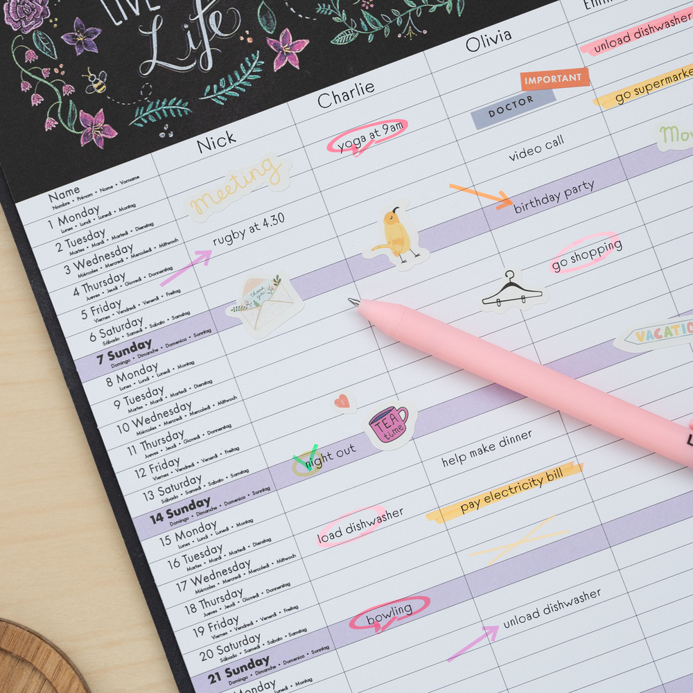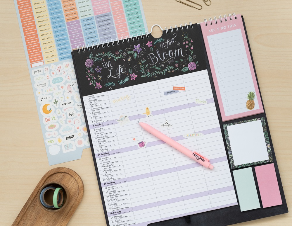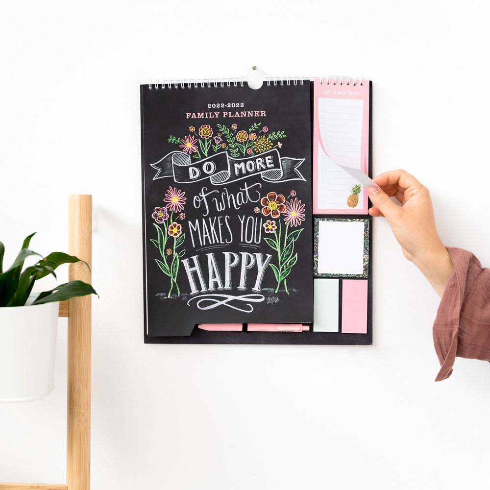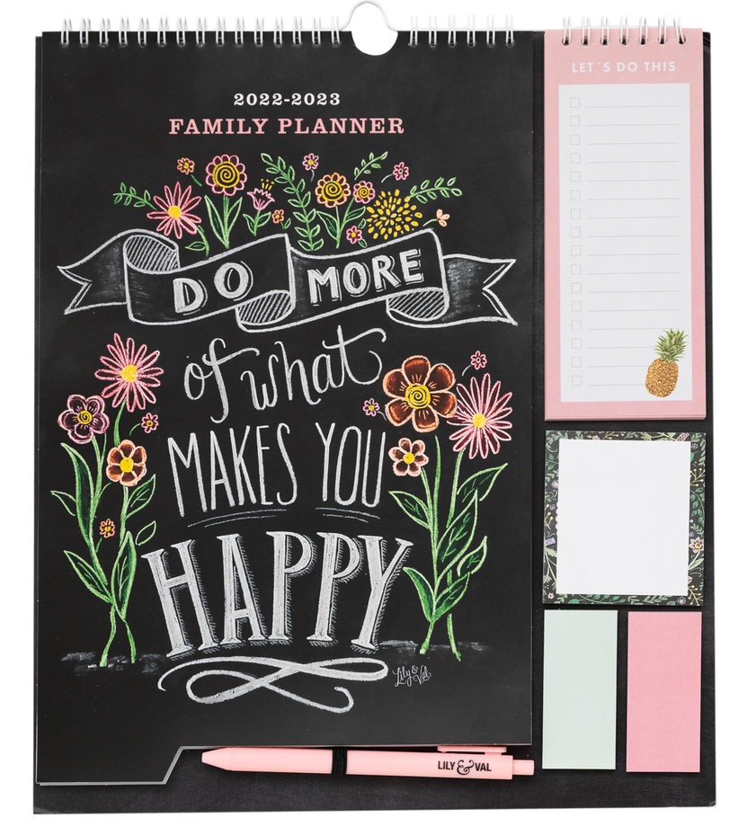 Planner lunar din septembrie 2022 până în decembrie 2023, cu spațiu pentru note organizate pe coloane. Include 1 blocnotes, trei blocnotes adezive, 1 foaie cu autocolante și 1 pix. Limbi: engleză, spaniolă, franceză, italiană și germană.