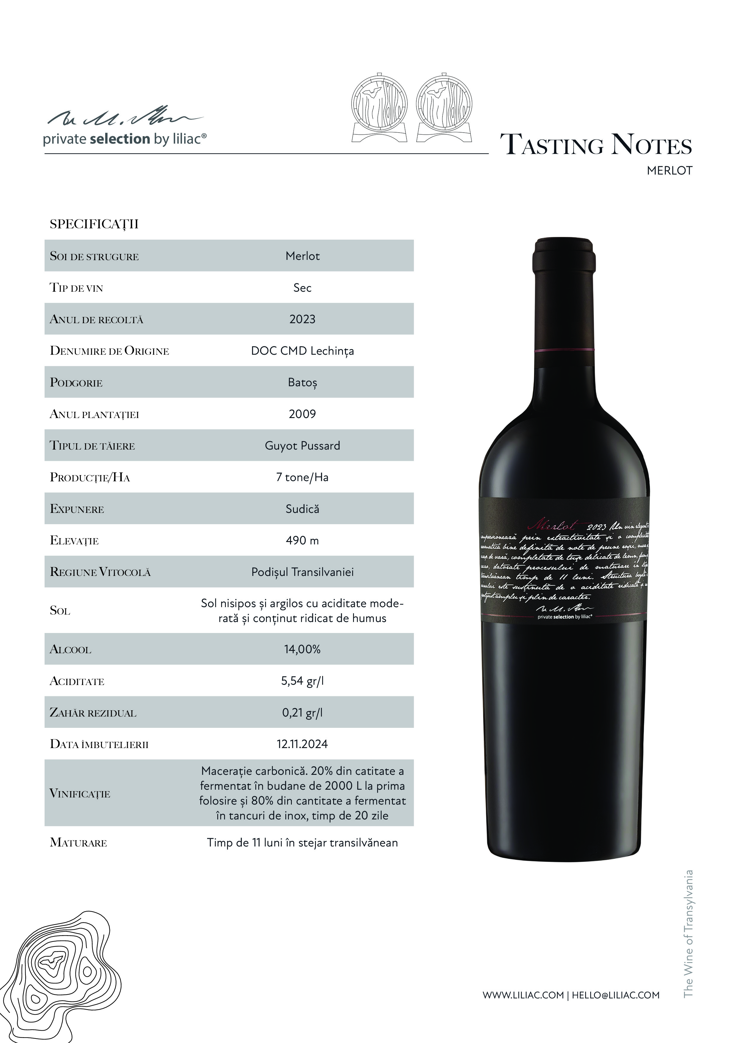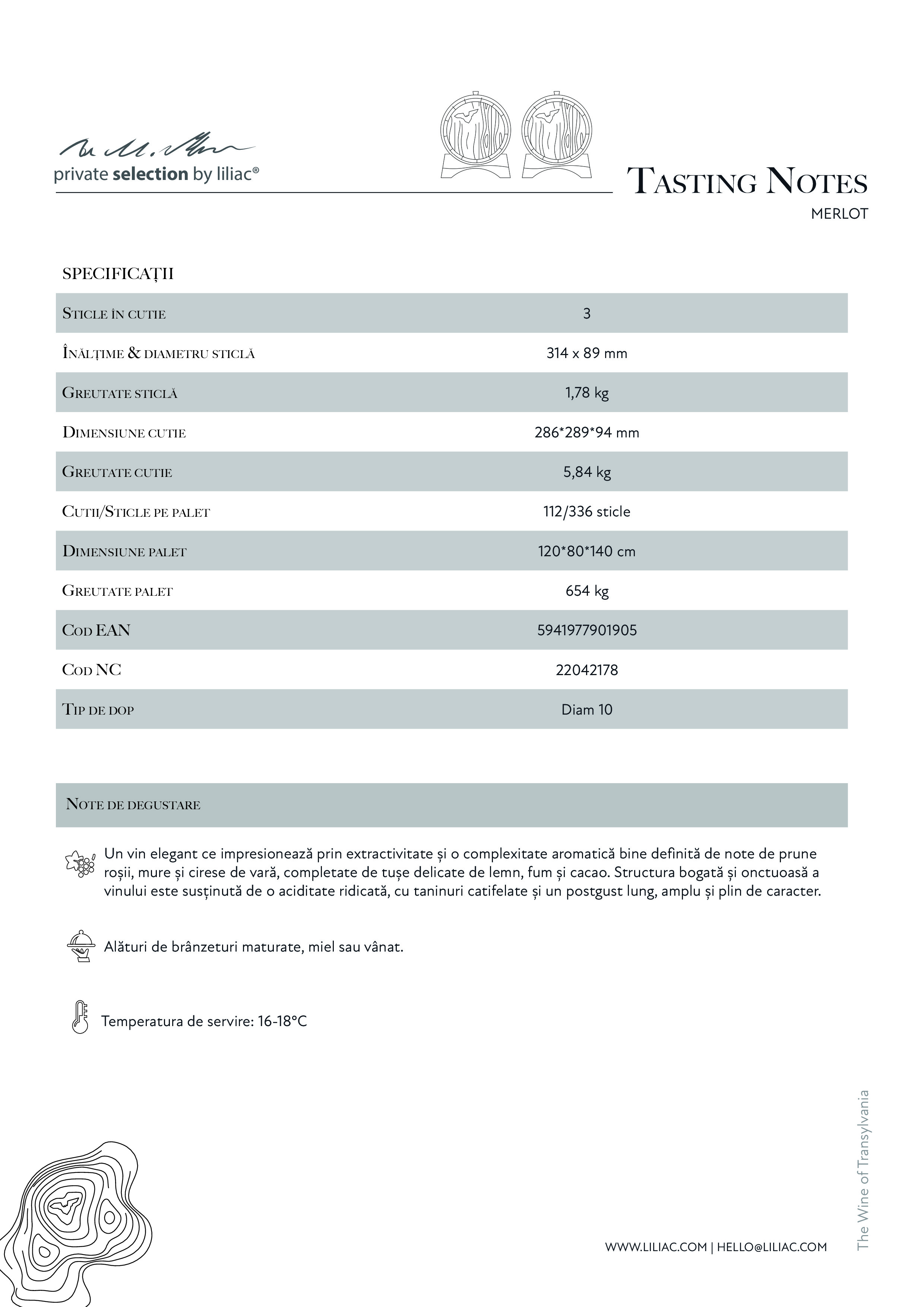 Un vin elegant ce impresionează prin extractivitate și o complexitate aromatică bine definită de note de prune roșii, mure și cirese de vară, completate de tușe delicate de lemn, fum și cacao, datorate procesului de maturare în stejar transilvănean timp de 11 luni. Structura bogată și onctuoasă a vinului este susținută de o aciditate ridicată, cu taninuri catifelate și un postgust lung, amplu și plin de caracter.