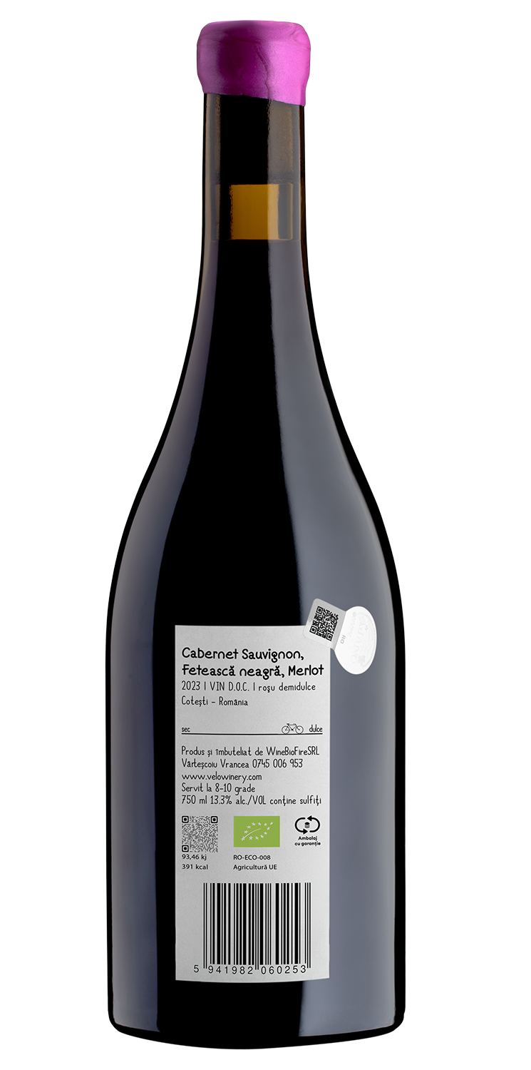 Descoperiți eleganța și complexitatea vinului demidulce roșu Fetească Neagră + Cabernet Sauvignon + Merlot de la Crama Velo. Un vin ecologic de excepție, perfect pentru a fi savurat în momentele speciale și pentru a adăuga un plus de rafinament oricărei ocazii.