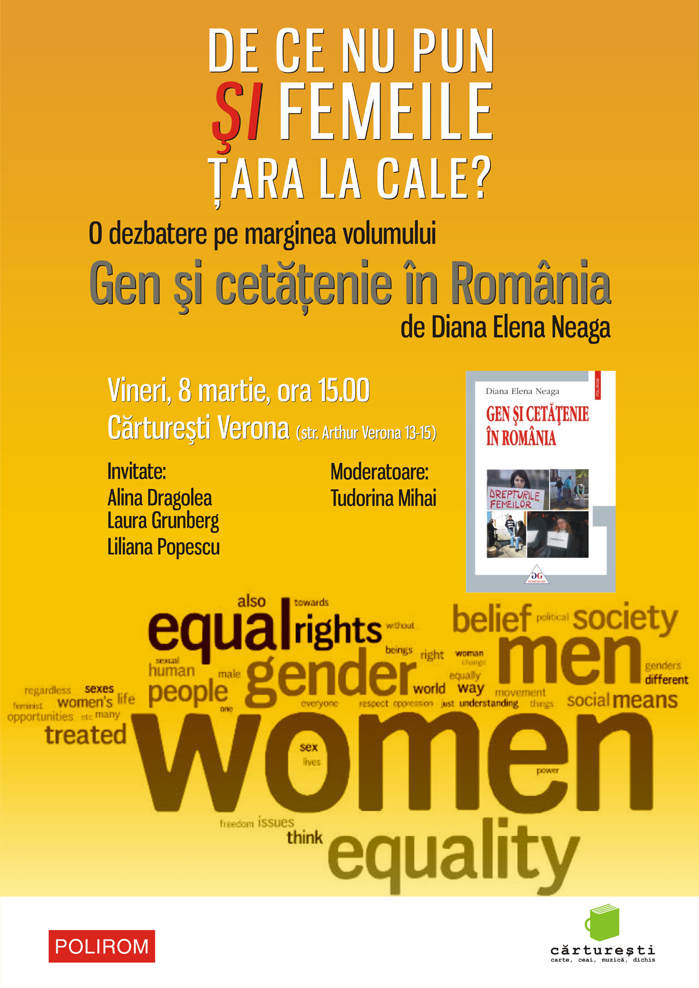 Vineri, 8 martie, de la ora 15.00, la Librăria Cărtureşti Verona (Ceainărie) din Bucureşti, va avea loc dezbaterea pe tema „De ce nu pun şi femeile ţara la cale?”, eveniment prilejuit de apariţia recentă a volumului Gen şi cetăţenie în România, semnat de Diana Elena Neaga, şi apărut recent în colecţia „Studii de gen” la Editura Polirom.