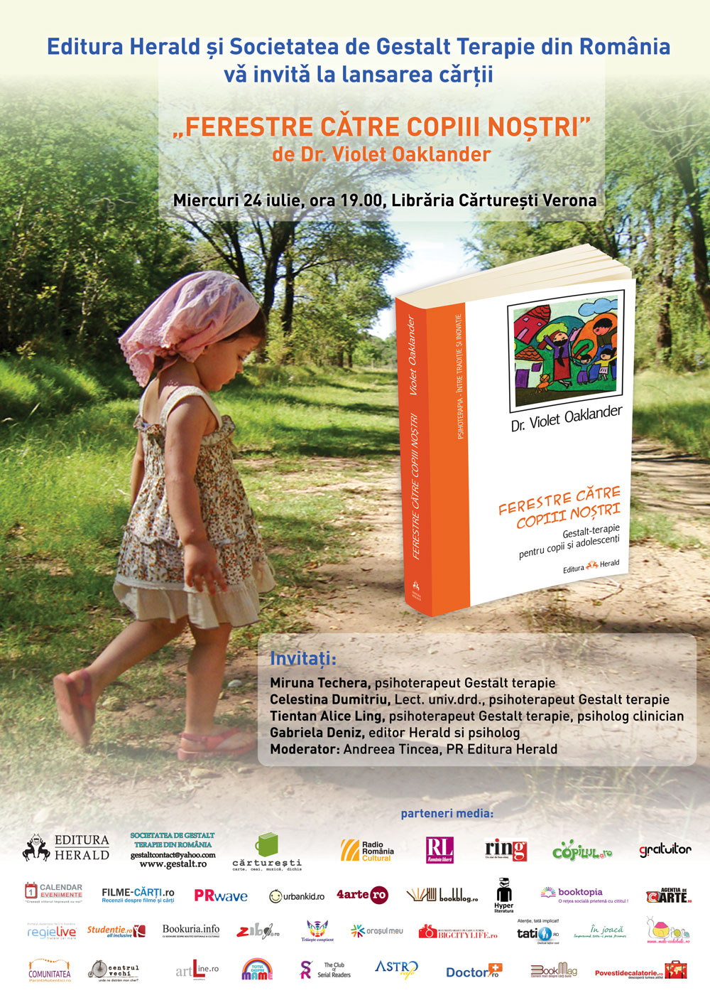 Vă invităm miercuri, 24 iulie 2013, ora 19:00, la Librăria Cărtureşti Verona la lansarea cărţii „FERESTRE CĂTRE COPIII NOŞTRI – Gestalt-terapie pentru copii şi adolescenţi”, scrisă de Dr. Violet Oklander şi publicata de editura Herald în colecţia „Psihoterapia”. ( http://goo.gl/zMtEm )