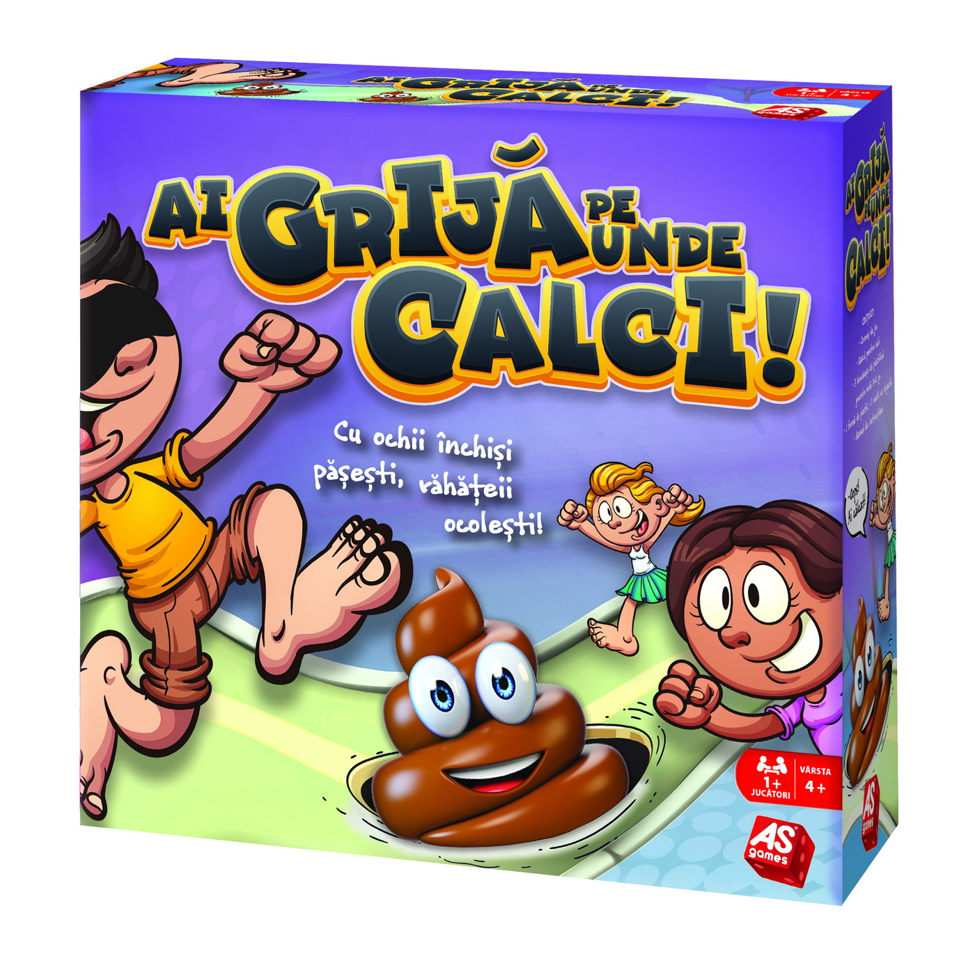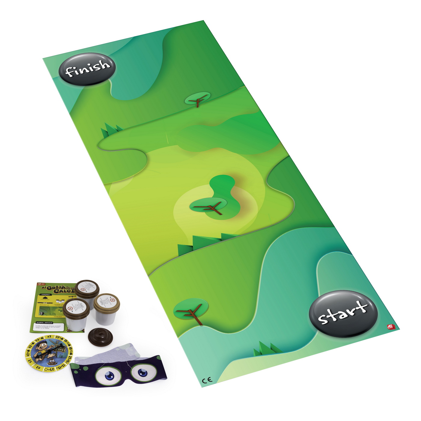 Ai grija pe unde calci este un joc extrem de amuzant cu consecinte... murdare! Pune-ti masca la ochi, invarte roata si apoi executa numarul de pasi pe covorasul de joc, egal cu numarul indicat pe roata. Ai grija! Calea e plina de rahatele din plastilina. Cine va reusi sa parcurga covorasul fara a calca in ei? Valori dezvoltate Coordonarea, Dexteritatea, Sociabilitatea, Creativitatea. Joc recomandat pentru varsta 4+.