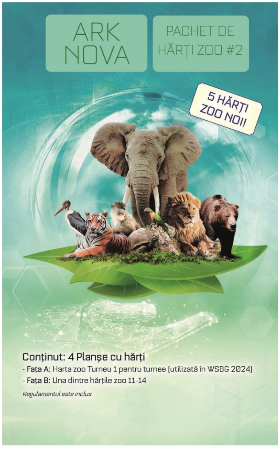 Dezvolta jocul de baza Ark Nova cu aceasta expansiune Zoo Map Pack 2 care contine 5 noi aspecte ale Hartii Zoo care includ cuvinte cheie si abilitati noi ale animalelor. Este inclus un ghid pentru a explica noile functii de pe Harti.