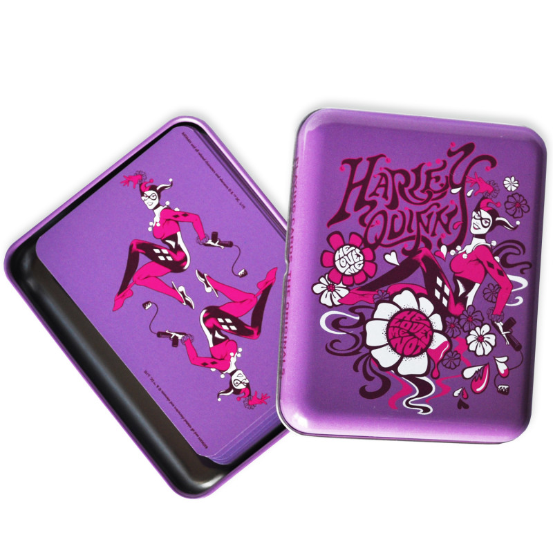 Carti de joc deosebite, in cutie metalica de colectie, cu celebra super eroina de film si desene animate, Harley Quinn.