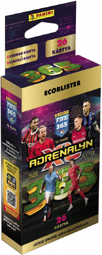 Conținutul pachetului Panini Fifa 365 ADRENALYN XL 2025 Ecoblister: 4 pachete de cărți + 2 cărți limitate