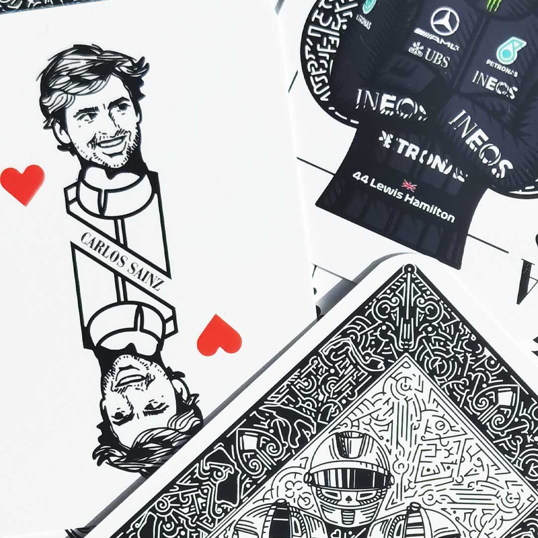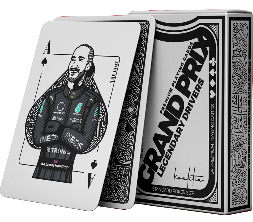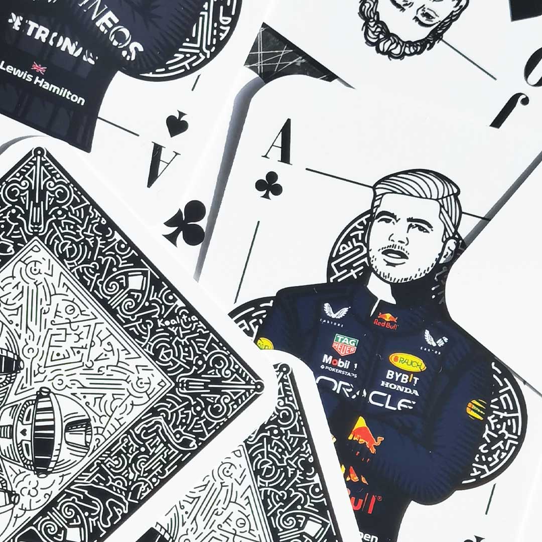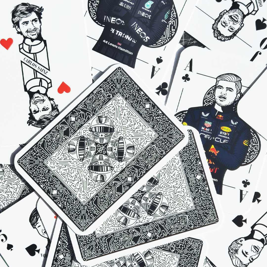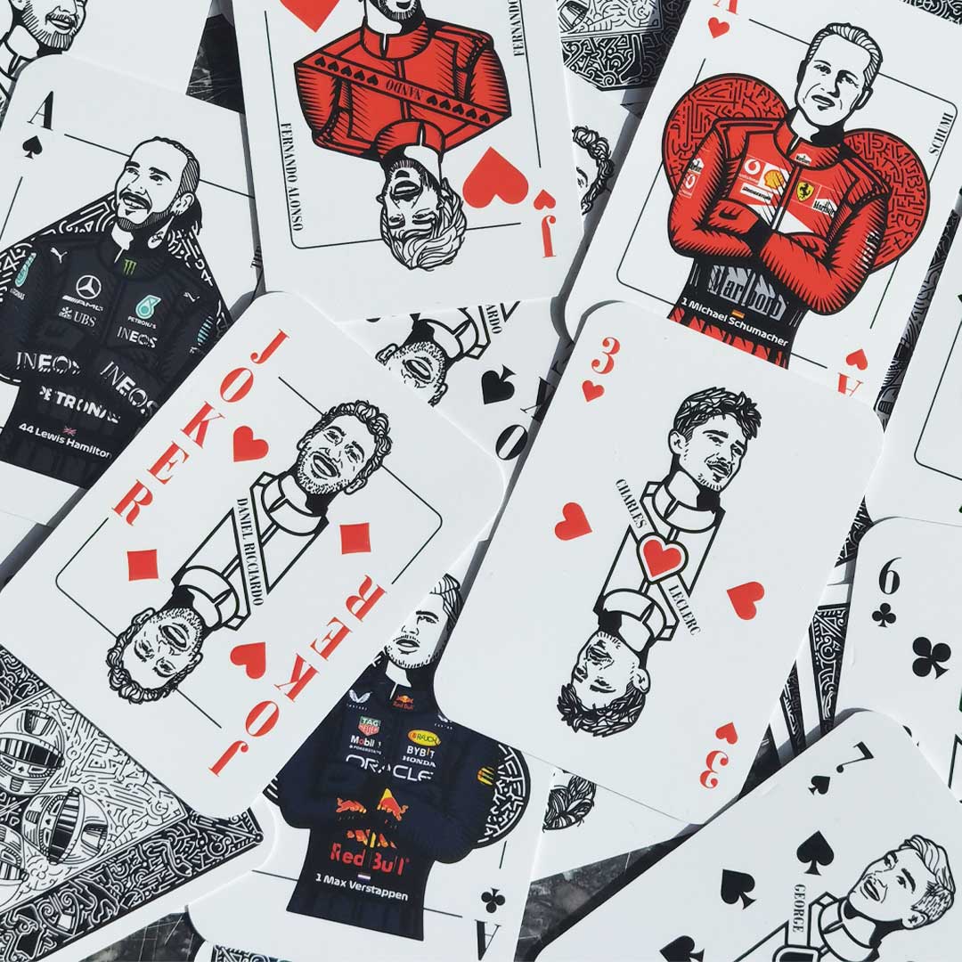 Formula 1 prezentând șoferi legendari precum Ayrton Senna, Michael Schumacher și Lewis Hamilton. Ilustrațiile intricate surprind esența carierelor lor, aducând un omagiu eroilor Formulei1. Cărțile sunt create în dimensiunile standard de poker de 63.5 x88.8 milimetri (2.25 x 3.5 inci).
