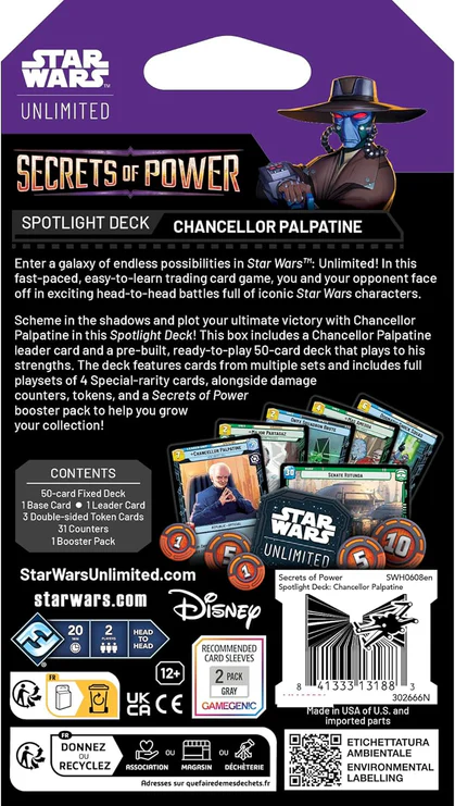 Dezvăluie-ți mâna exact la momentul potrivit cu Padmé Amidala sau complotează în umbră și plănuiește-ți victoria finală cu Chancellor Palpatine cu aceste pachete Spotlight! Aceste pachete predefinite, gata de joc, cu 50 de cărți, oferă tot ce ai nevoie pentru a te arunca în al șaselea set al jocului.