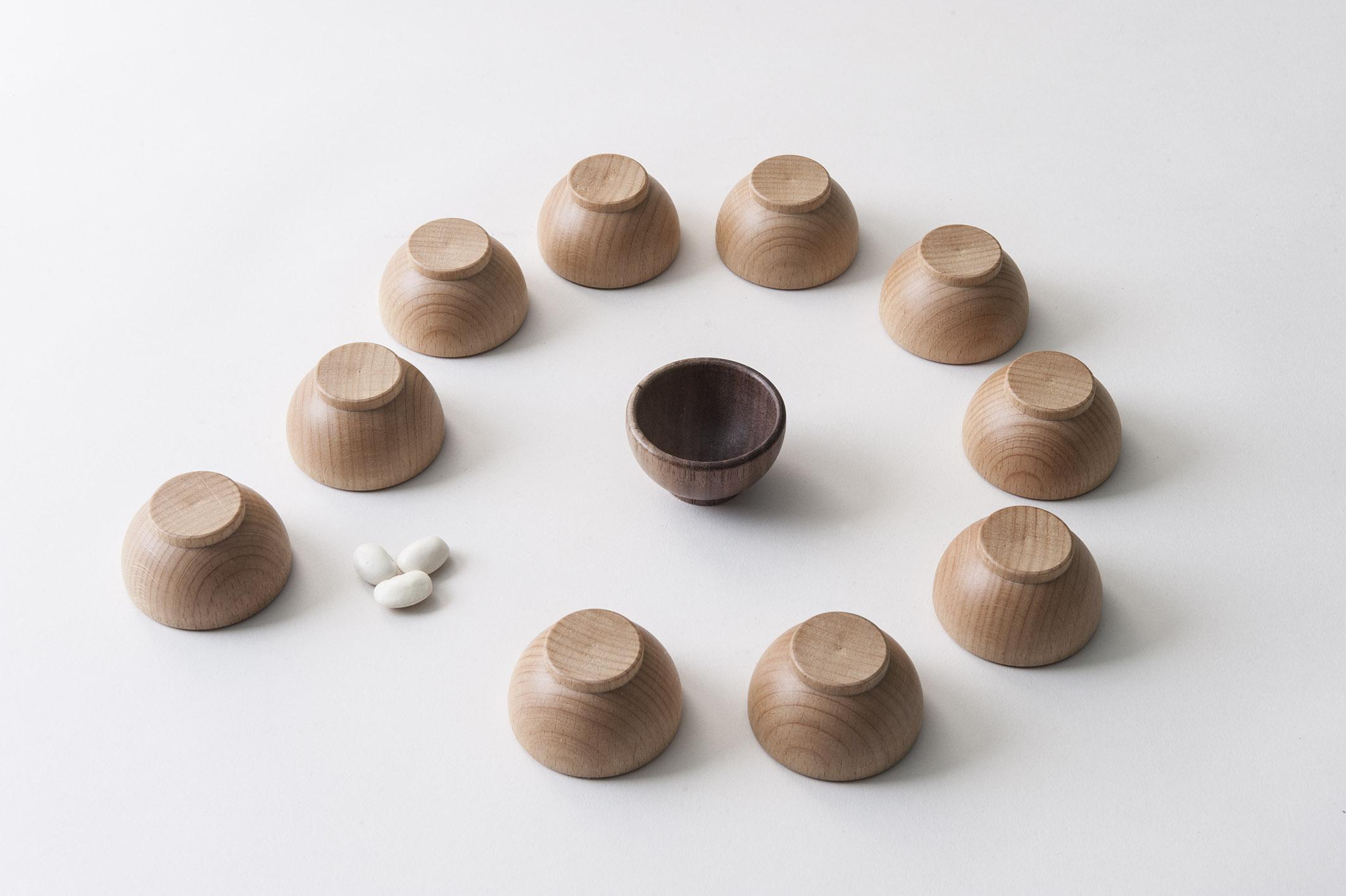 Jocul contine 16 cupe de lemn gri, 1 cupa de lemn alba, 1 cupa de lemn neagra, 80 de boabe de fasole si regulamente pentru 4 variante diferite de joc: