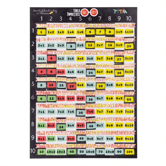 Observi că unele numere din tabla înmulțirii se repetă, iar altele nu. Vei observa acest lucru datorită culorilor. Spre exemplu, 18 apare de 4 ori pe tablă (18 galben, 18 roșu, 18 albastru, 18 verde).