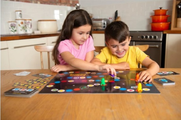 Conținut: 4 pioni de plastic în formă de rachetă, tablă de joc, 36 de cărți cu task-uri de deplasare pe tabla de joc, 20 de cărți cu stea, 8 cărți de misiuni și instrucțiuni de utilizare.