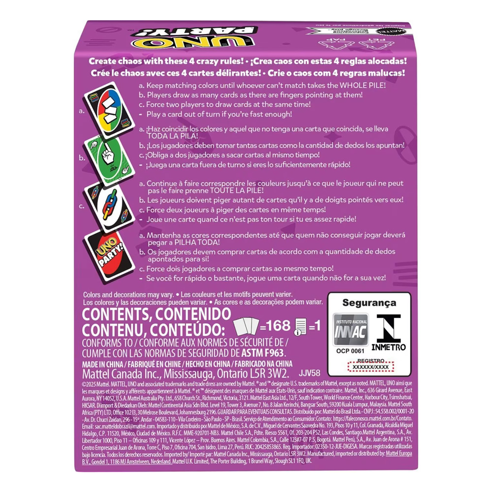 Pregateste-te pentru cea mai distractiva versiune a jocului clasic UNO! UNO Party aduce reguli mai nebunesti si provocari amuzante pentru grupuri mai mari, transformand orice intalnire intr-o adevarata petrecere. Cu carti speciale si momente pline de ras, jocul devine si mai competitiv si imprevizibil. Perfect pentru serile petrecute in familie sau cu prietenii, UNO Party este alegerea ideala pentru 6 pana la 14 jucatori. Striga UNO, distreaza-te si descopera cat de departe poti merge in acest joc plin de energie si voie buna!