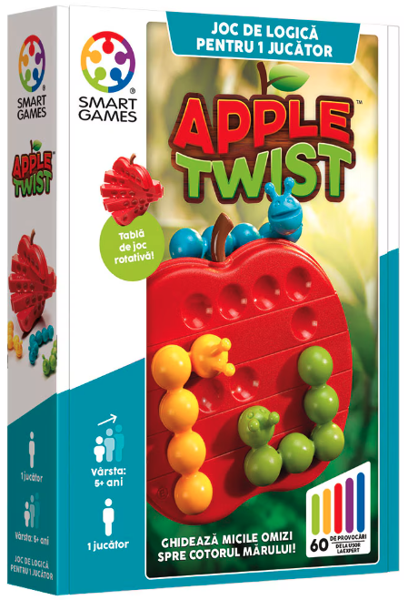 Apple Twist este un joc de logica pentru copii din seria Smart Games cu elemente de inalta calitate. Jocul include 60 de provocari logice cu dificultati crescatoare, recomandat pentru varstele 5+, care testeaza si dezvolta abilitatile cognitive ale jucatorilor.