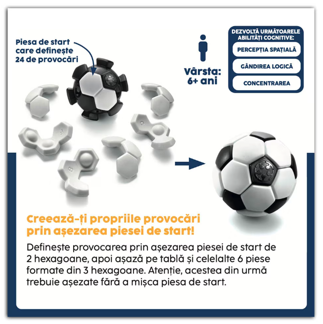 Contine: 1 cadru in forma de minge, 7 piese de puzzle (6 compuse din 3 hexagoane si 1 din 2 hexagoane)i.